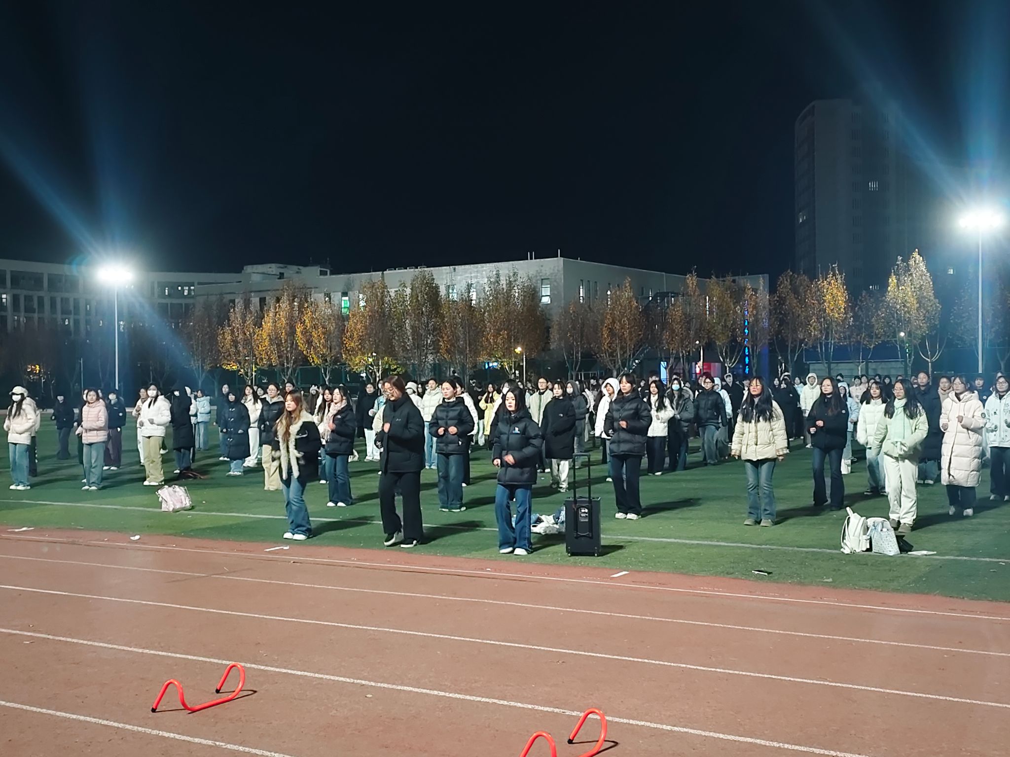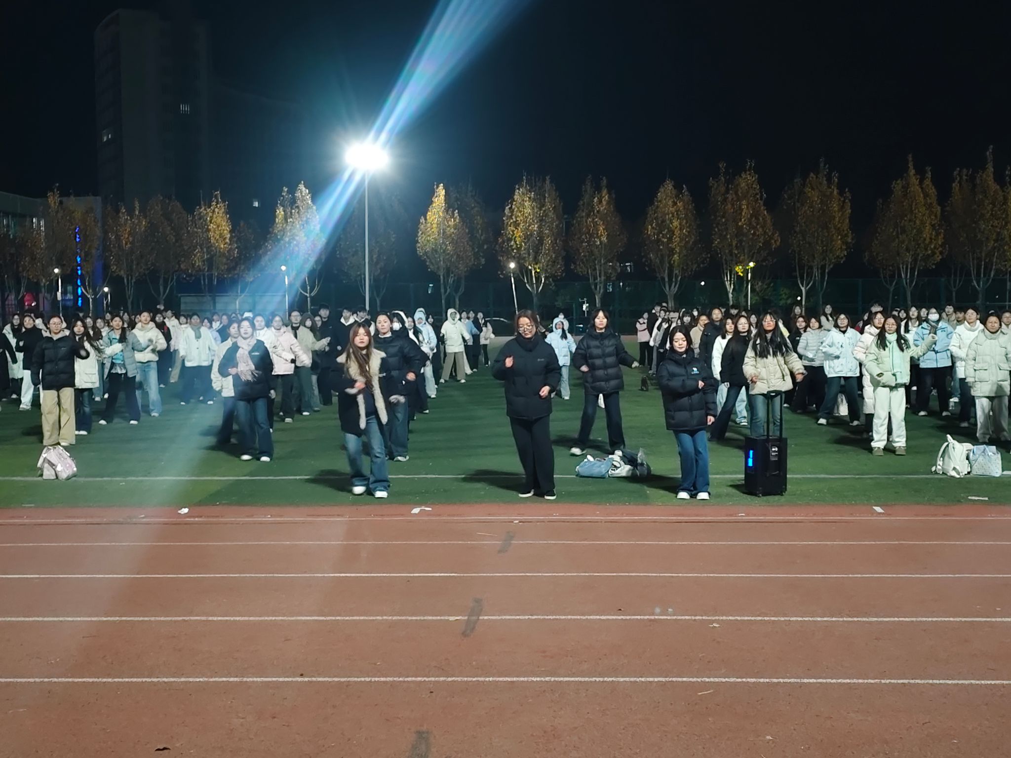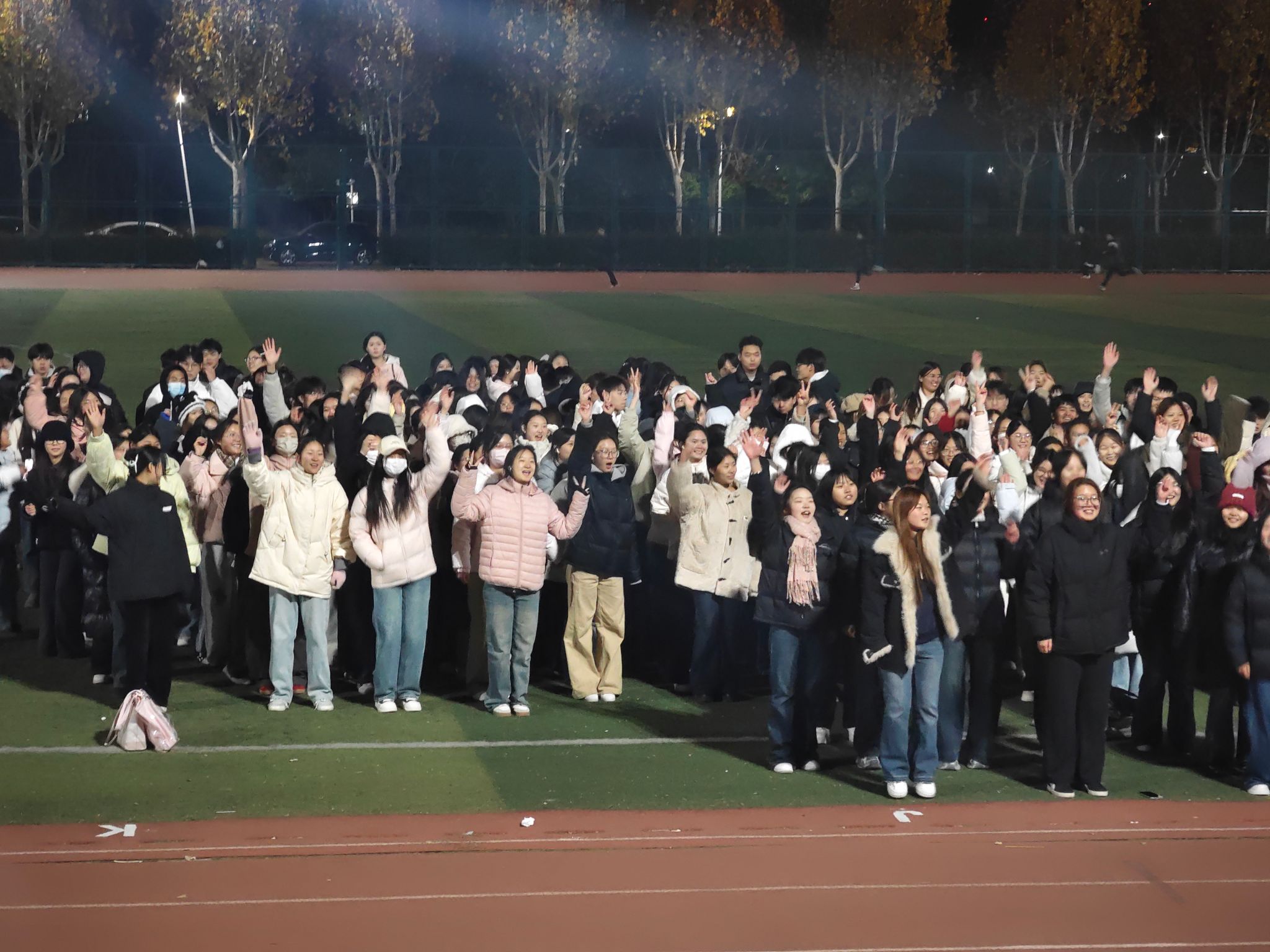 活动现场氛围热烈到极致,随着音响设备传出动感旋律,全场瞬间进入“律动模式”。同学们同步扬起手臂,指尖划过灯光的轨迹整齐划一;转身时身体的弧度精准契合节拍,跳跃的脚步落地时发出整齐的声响,连摆动的衣角都在夜色中形成统一的律动曲线。尽管冬日的晚风带着凉意,同学们的脸上却满是笑意与专注:有人眼神紧紧跟着前排同学校准动作,有人嘴角上扬跟着音乐轻哼旋律,这份投入让寒意全然消散。高亮度的灯将人群的身影清晰投射在地面,各班队伍排成整齐的方阵,光影交错间,每一个动作都充满力量与美感。