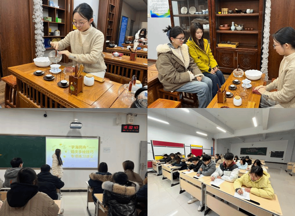 在空乘专业的礼仪专项课上,重点围绕站姿、服务手势等核心规范进行详尽讲解;婚庆专业则开展了手绘技巧的专项训练,从线条勾勒到色彩搭配,同学们积极参与,专注绘制主题场景手稿;会展专业聚焦于现场管理与策划,结合大型展会案例,引导同学们分组撰写小型会展策划案;茶艺专业的技能课上,通过现场演示不同茶类的冲泡技艺,同学们手持茶具进行实操练习,在茶香氤氲中掌握茶礼规范与冲泡技巧。
