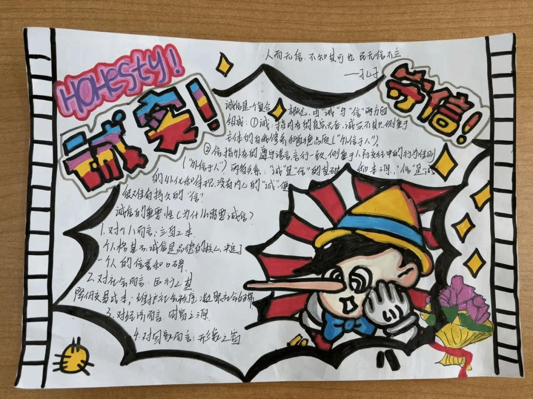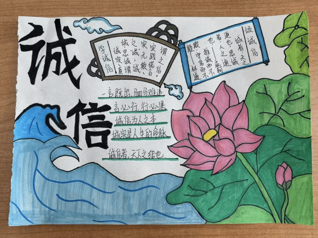 创作过程中,学生作品紧扣“诚信感恩”核心,兼具思想性与艺术性。其中,有作品以匹诺曹经典形象为载体,通过漫画分镜对比诚信与失信的不同结果,直观诠释“诚为心之真、信为行之诺”的深刻内涵;另有作品巧妙融合国风元素,以象征高洁的荷花呼应“君子守信”的传统美德,搭配“一言既出,驷马难追”等经典格言,让传统文化与当代德育理念有机融合,展现出独特的创作巧思。