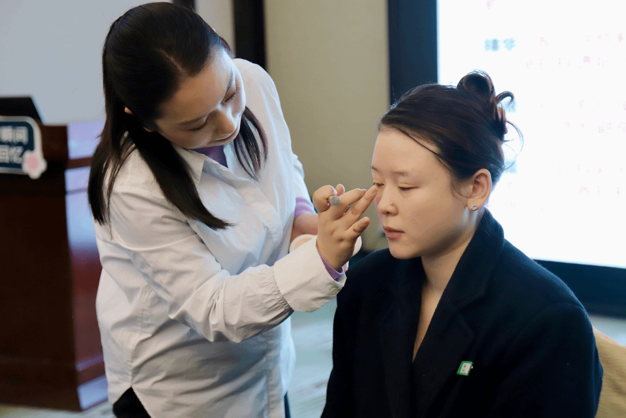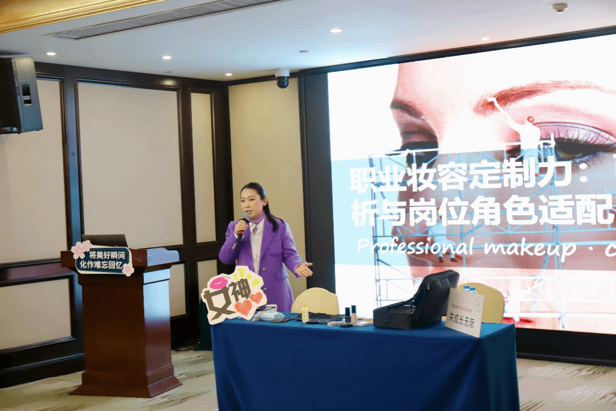 培训中,代天娇老师围绕“职业妆容定制力”展开系统讲解。她指出,在高端服务业中,妆容不应千篇一律,而需结合面部结构、行业特点进行个性化设计。代老师从“三庭五眼”的比例分析入手,逐步讲解不同脸型与眉形的搭配技巧、各类眼型的眼影修饰方法,并融入马夸特面具审美理论,帮助学员理解妆容与面部结构的和谐关系。