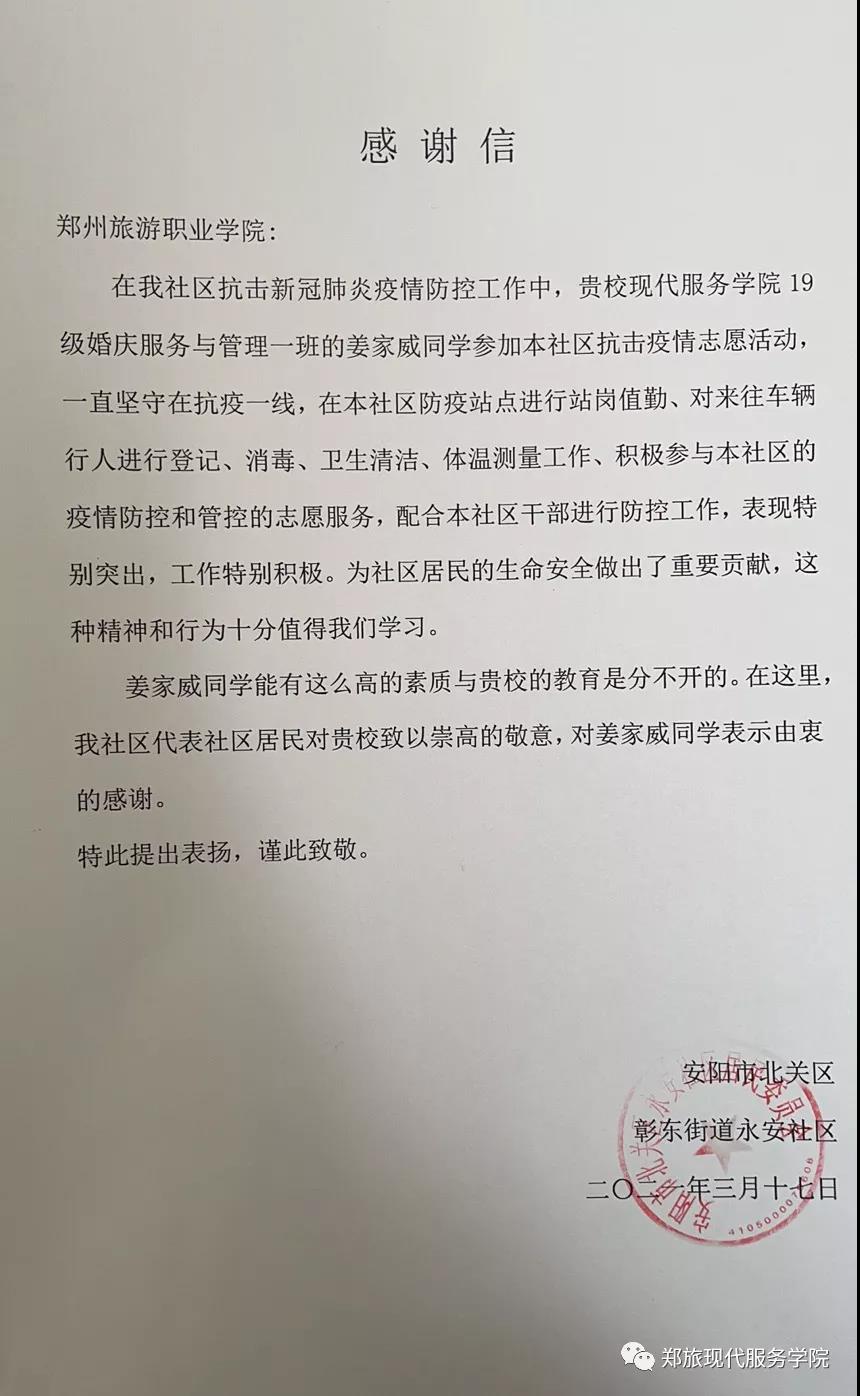 在我社区抗击新冠肺炎疫情防控工作中,贵校现代服务学院19级婚庆服务与管理班的姜家威同学参加本社区抗击疫情志愿活动,一直坚守在抗疫一线,在本社区防疫站点进行站岗执勤、对来往车辆行人进行登记、消毒、卫生清洁、体温测量工作、积极参与本社区的疫情防控和管控的志愿服务,配合本社区干部进行防控工作,表现特别突出,工作特别积极。为社区居民的生命安全做出了重要贡献,这种精神和行为十分值得我们学习。