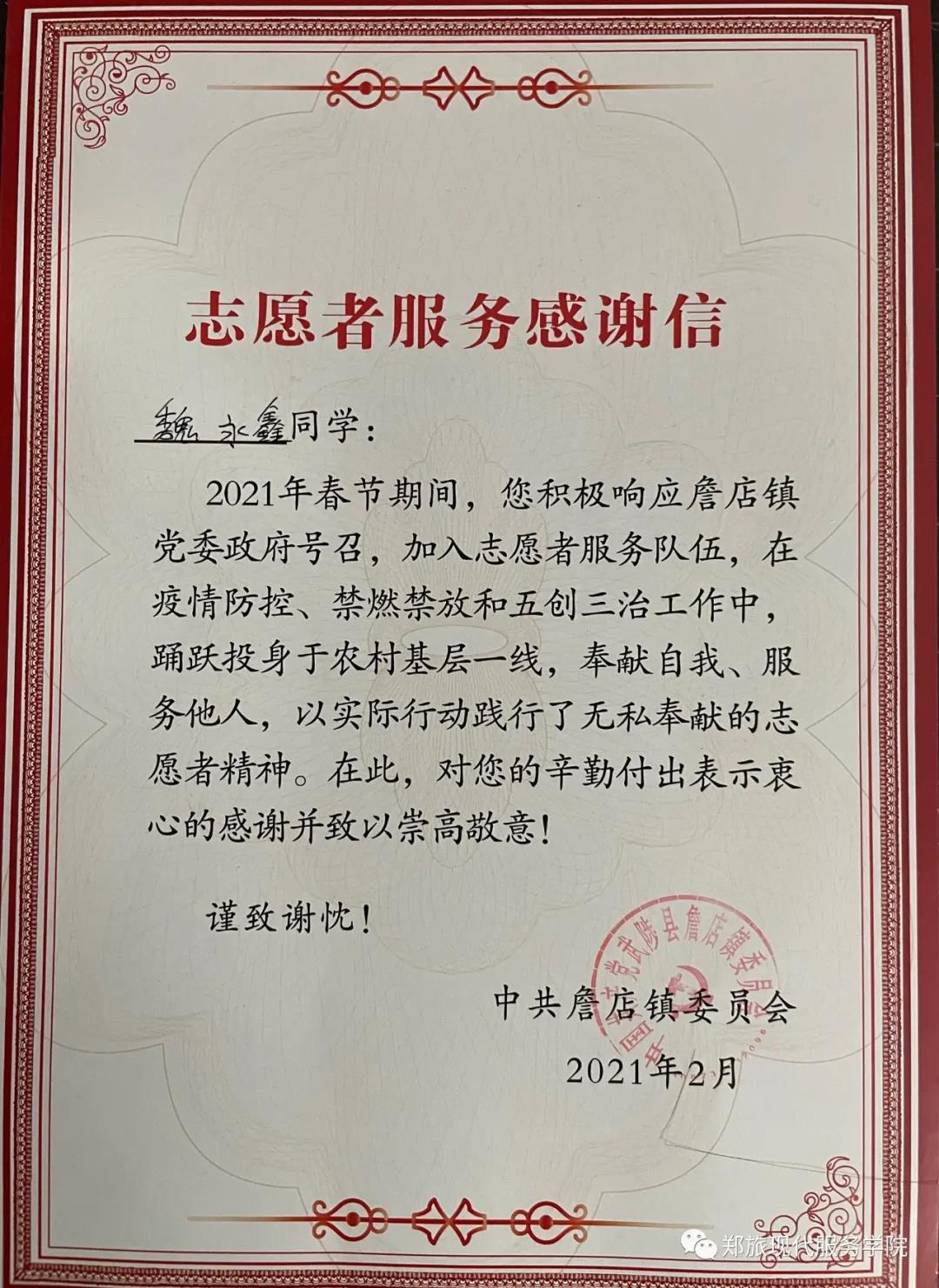 2021年春节期间,您积极响应詹店镇党委政府号召,加入志愿者服务队伍,在疫情防控、禁燃禁放和五创三治工作中,踊跃投身于农村基层一线,奉献自我、服务他人,以实际行动践行了无私奉献的志愿者精神。在此,对您的辛勤付出表示衷心的感谢并致以崇高敬意!