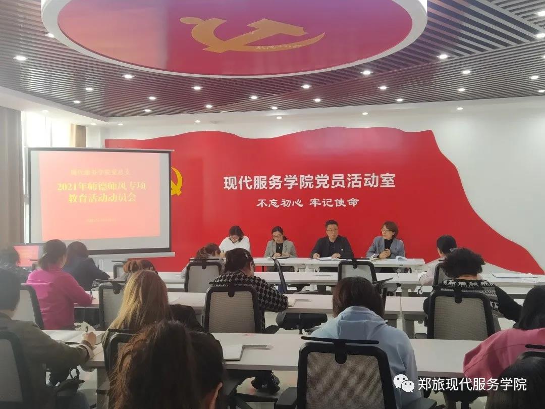 为深入贯彻落实教育部相关文件精神,配合学院开展师德师风教育活动,激发教师爱岗敬业的热情,塑造教师队伍的良好形象,全面提高我院教师职业道德素质,2021年4月28日,现代服务学院在1A208党员活动室组织召开师德师风专项活动动员会。现代服务学院领导班子参会,会议由现代服务学院党总支书记郭防主持会上郭防组织全体教师学习教育部《关于加强和改进新时代师德师风建设的意见》和《新时代高校教师职业行为十项准则》,希望全体教师关爱学生,廉洁从教,切实做到以生为本,为提高学生核心素养,促进学生全面发展而努力工作。现代服学院院长许向蒲宣读了本次活动的具体内容及安排,并要求本次师德师风专项活动动员大会,统一思想,明确目标,促进现代服务学院师德教育管理体系的形成,进一步规范教师的育人行为,提升我院精神文明建设水平,为我院正师风、强师能,打造一支无私奉献、业务精湛的教师队伍提供思想保证。
