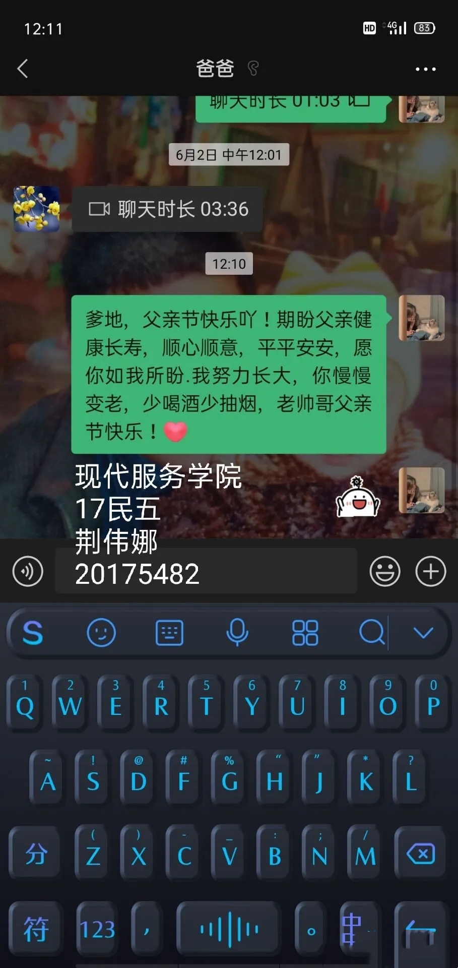 为感恩爸爸一直以来的付出,营造幸福美满的家庭氛围,使新时代文明融入日常生活实践中,6月20日,现代服务学院开展“岁月有尽,父爱无疆”父亲节祝福语活动。让爱化为甜蜜的祝福,给父亲送上一份爱的心意。在这个属于父亲的节日里,同学们通过线上祝福的形式对爸爸送去了满满的祝福,不管是文字、红包亦或者是表情包,他们把爱藏在祝福里,悄悄表达对父亲浓浓的爱。父亲的角色在孩子成长的道路上有着不可或缺的作用,在现代家庭中,爸爸在孩子们心目中的形象是威严的,孩子们与爸爸交流接触的机会甚少,借此活动,搭建起孩子们与父亲爱的桥梁,更好的感受父爱,感恩父亲。通过此次活动的开展,拉进了同学们与父亲之前的情感距离,弘扬了传统美德,引导同学们理解父爱,感知父爱,从而真正做到心怀感恩、幸福前行。
