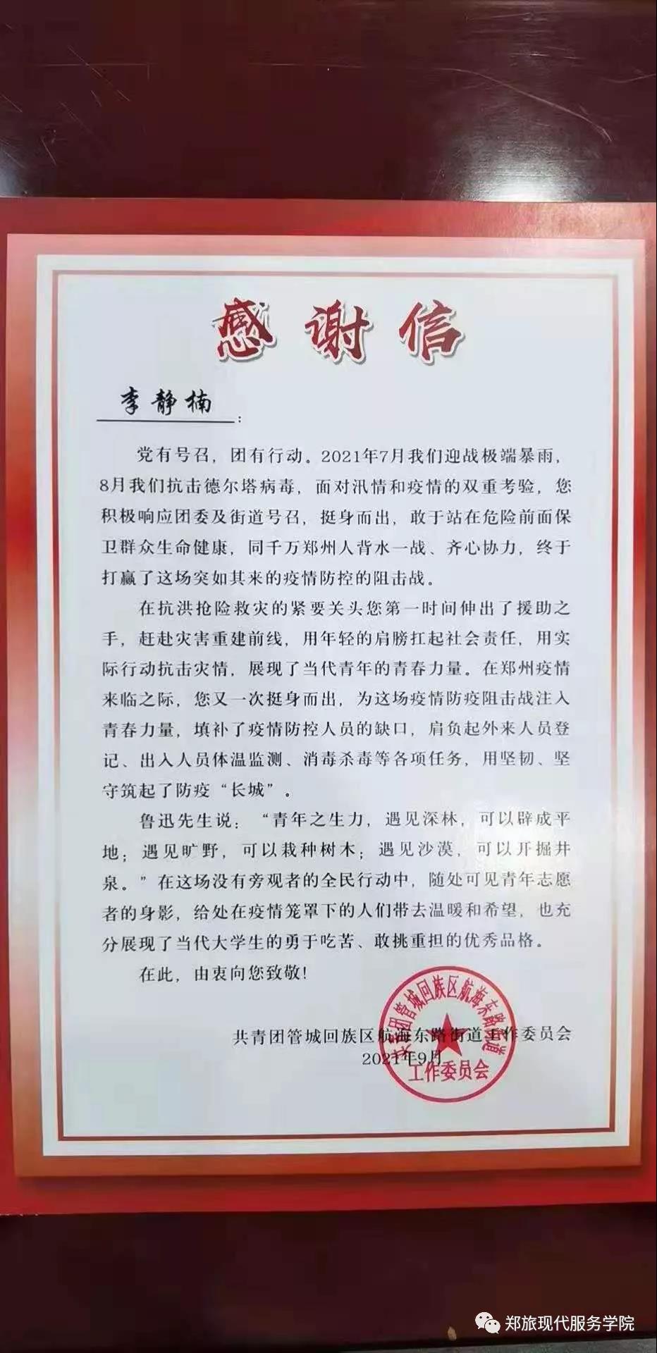 因在救灾防疫工作中的优异表现,共青团管城回族区航海路街道工作委员特发来感谢信:在抢险救灾的紧要关头李静楠第一时间伸出援手,用年轻的肩膀扛起社会责任。在疫情来临之际,你又一次挺身而出,用坚韧、坚守筑起了防疫“长城”,给处在疫情笼罩下的人们带去温暖和希望,充分展现了当代大学生的勇于吃苦、敢挑重担的优秀品格。