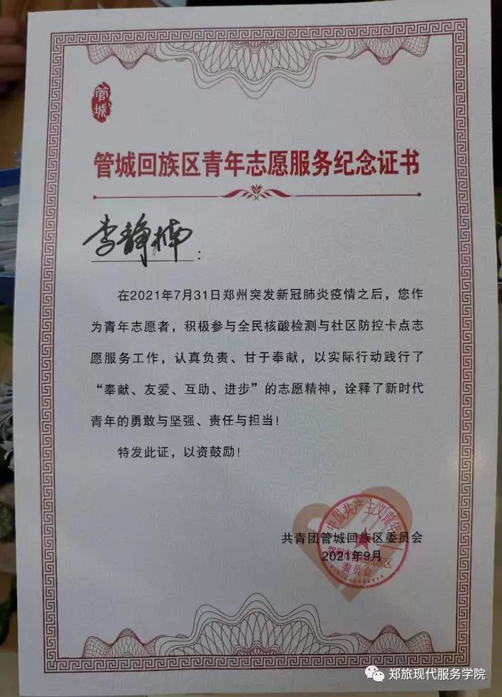 之后,李静楠同学参加了疫情防控工作,共青团管城回族区委员会为其颁发纪念证书:郑州突发新冠肺炎疫情后,您积极加入志愿服务工作,认真负责、甘于奉献,以实际行动践行了“奉献、友爱、互助,进步”的志愿精神。