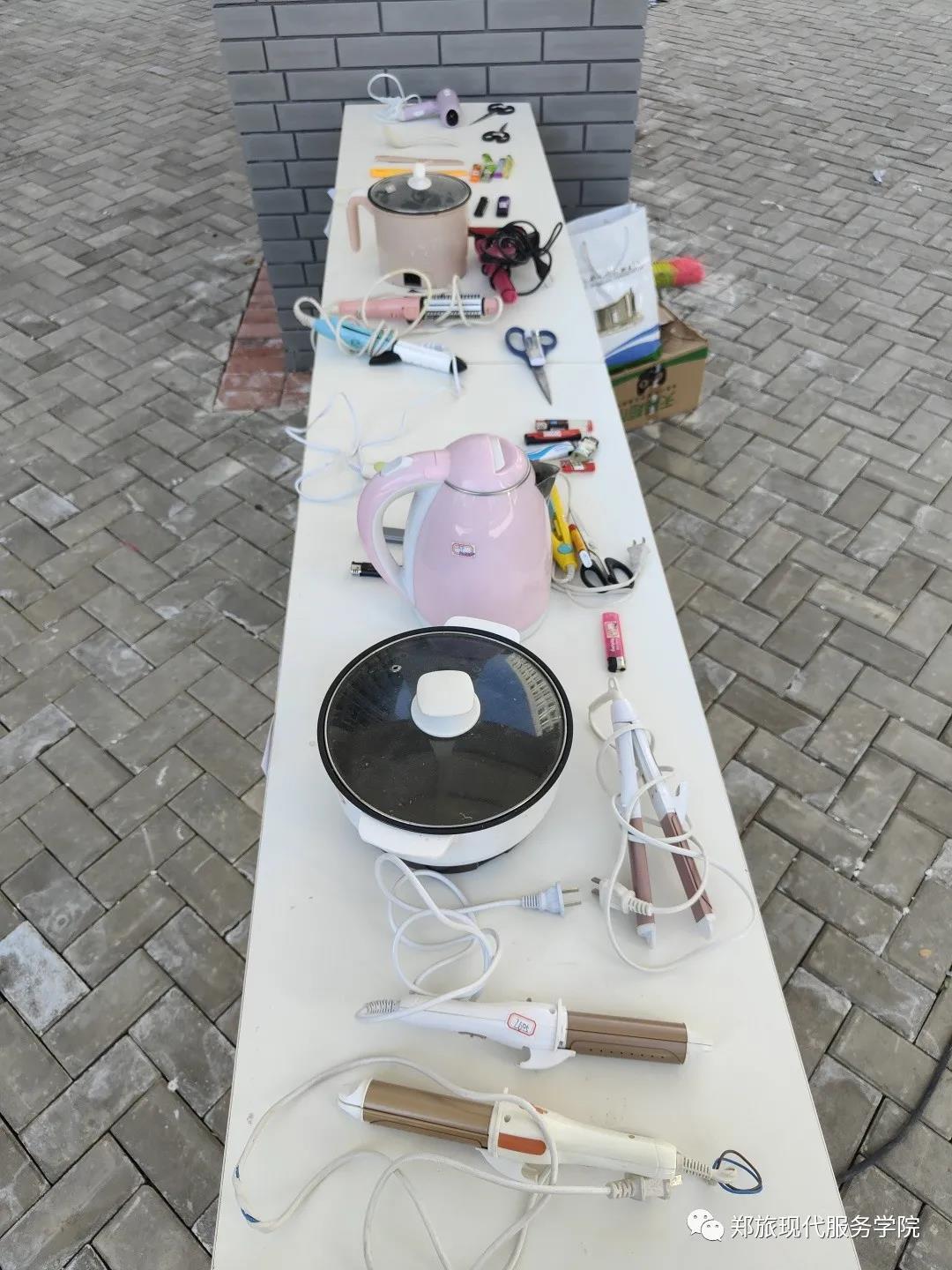 现场展示了学生宿舍常见的各类违禁品,包括卷发棒、电热锅、电子烟、打火机等。