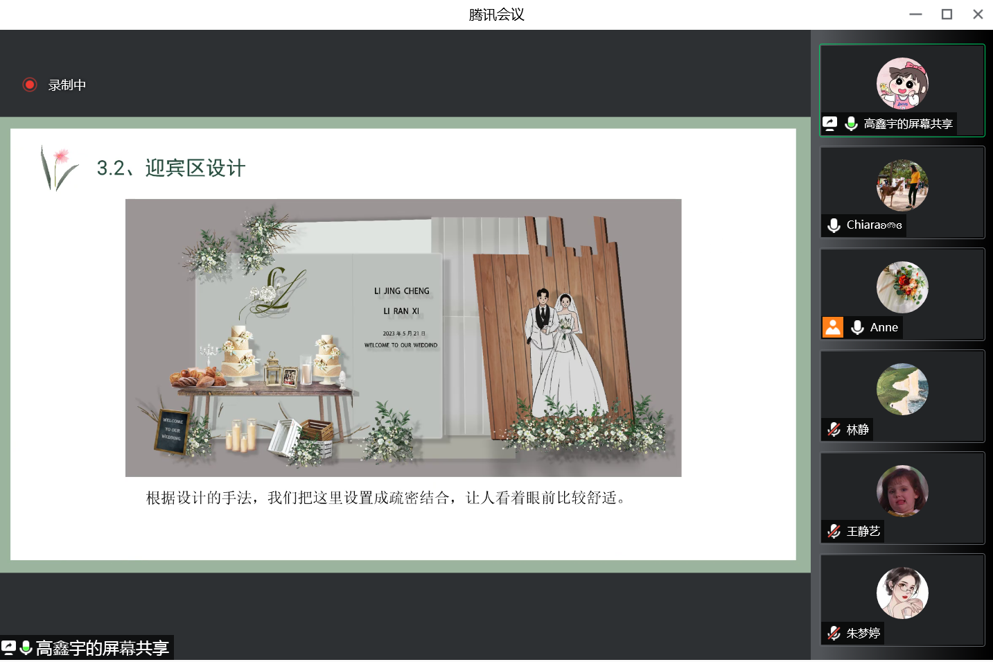 参加本次毕业答辩的8个小组按照事先的抽签顺序进行PPT汇报展示,每组不超过8分钟。小组负责人分别从新人信息、配色方案、元素提取、婚礼预算、现场布置、宴会花艺、婚礼流程、应急预案等方面进行介绍,展示婚礼策划技能。之后进行5分钟的答辩。评委根据策划书的内容提出相关问题或建议,小组成员现场回答。评委老师参考文案说明书、课件制作、演讲水平、电脑手绘等指标,并结合小组答辩情况进行评分。整体而言,学生基本掌握了婚礼方案撰写的方法,内容充实,设计多样,展示时语言流畅,条理清晰,但个别小组婚礼预算不够合理,设计方案格式不够规范等,还需要进一步的修改。