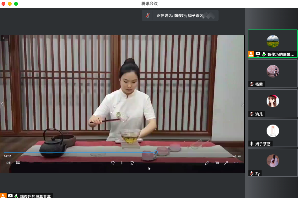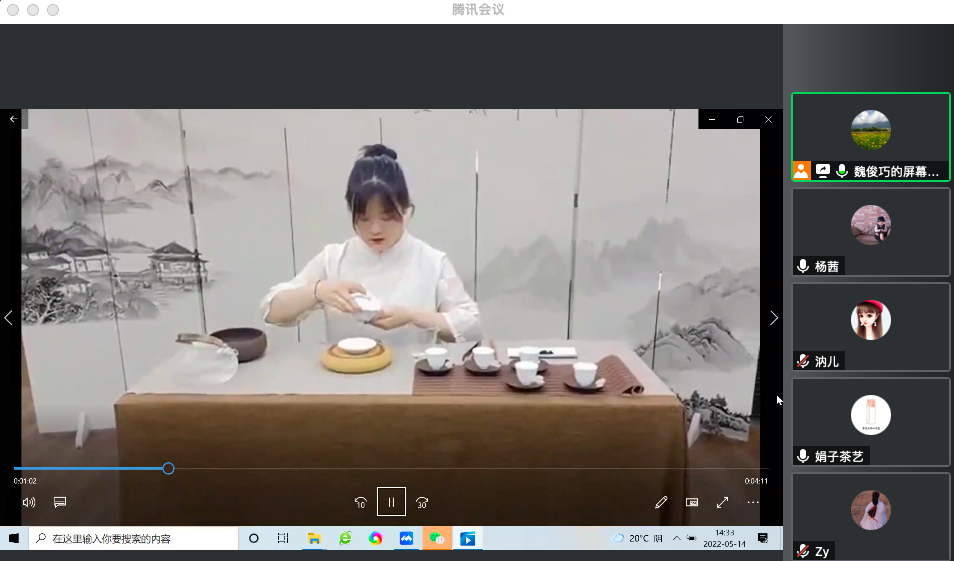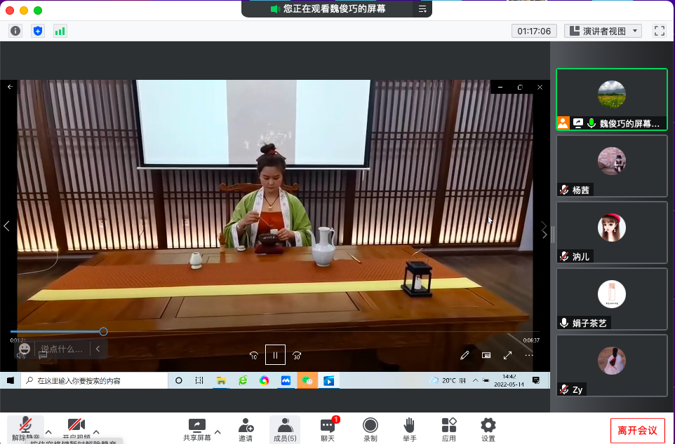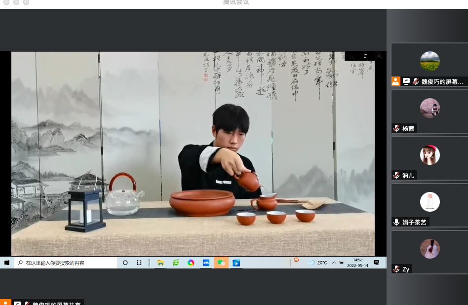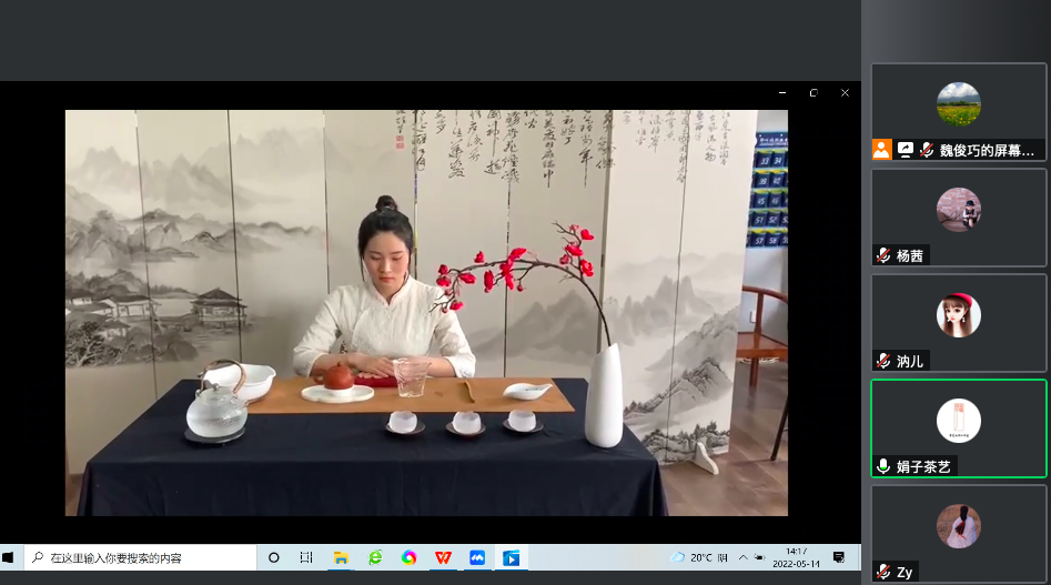 2022年5月14日下午,茶艺与茶文化教研室通过腾讯会议召开了2020级休闲服务与管理专业学生毕业设计线上展示汇报。学生经过两个月的准备,从文案编写、设计茶席、茶器购置、茶艺编排到最后的表演呈现,每个细节都体现着学生和指导老师的辛勤付出,通过共同努力毕业设计展示圆满落幕。休闲专业毕业设计展示形式以茶艺表演的形式进行,即以茶为核心,把音乐、礼仪、环境、服装、造型、表演等多种艺术元素凝聚在一起,以茶艺表演的形式展现了20级休闲专业学生的学习成果,综合检验了学生对茶文化、茶席设计、茶叶冲泡等专业知识和技能的理解与掌握程度。