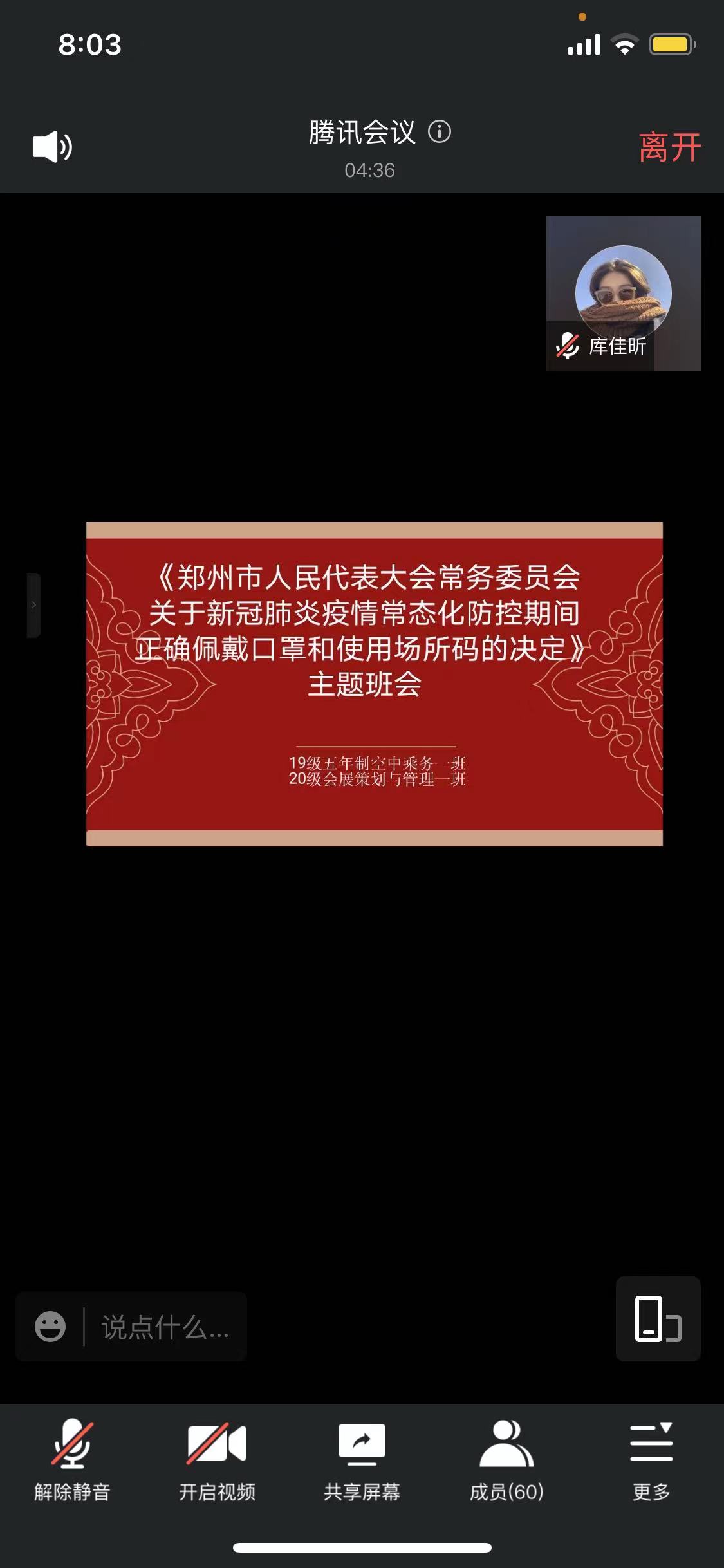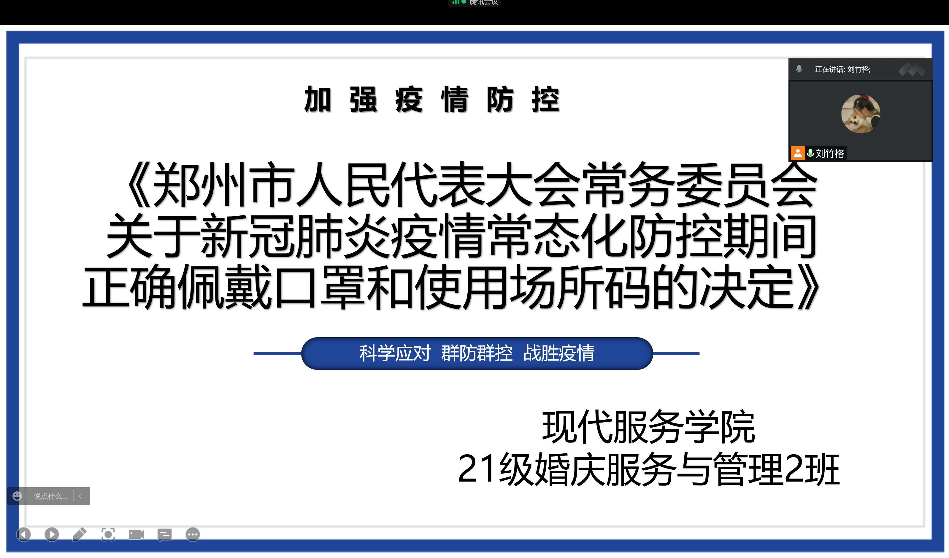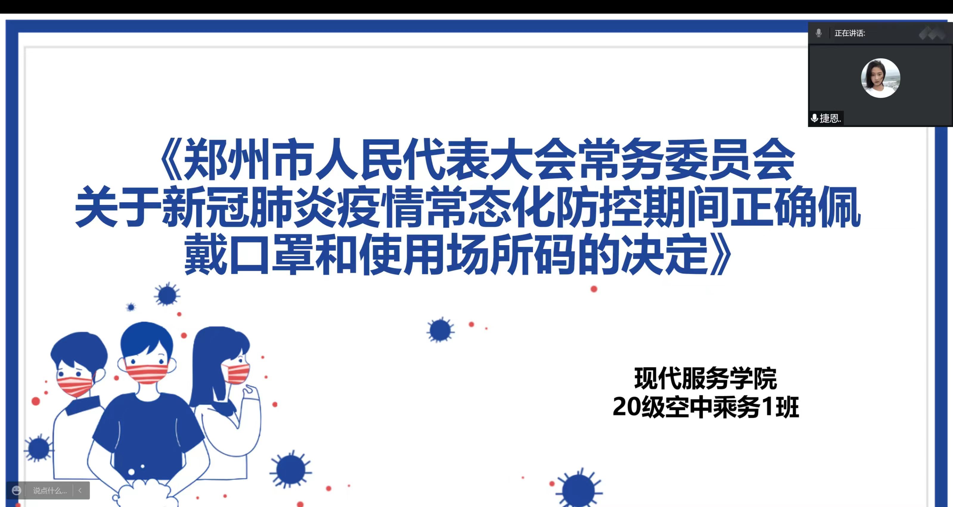 为了有效防控新冠肺炎疫情,坚决阻断疫情传播,保障人民群众生命健康安全,根据《中华人民共和国传染病防治法》《中华人民共和国突发事件应对法》《中华人民共和国治安管理处罚法》和国务院《突发公共卫生事件应急条例》等法律、法规,结合学院实际,现代服务学院20级、21级各班学生于2022年5月23日在线上开展《郑州市人民代表大会常务委员会关于新冠肺炎疫情常态化防控期间正确佩戴口罩和使用场所码的决定》主题班会。