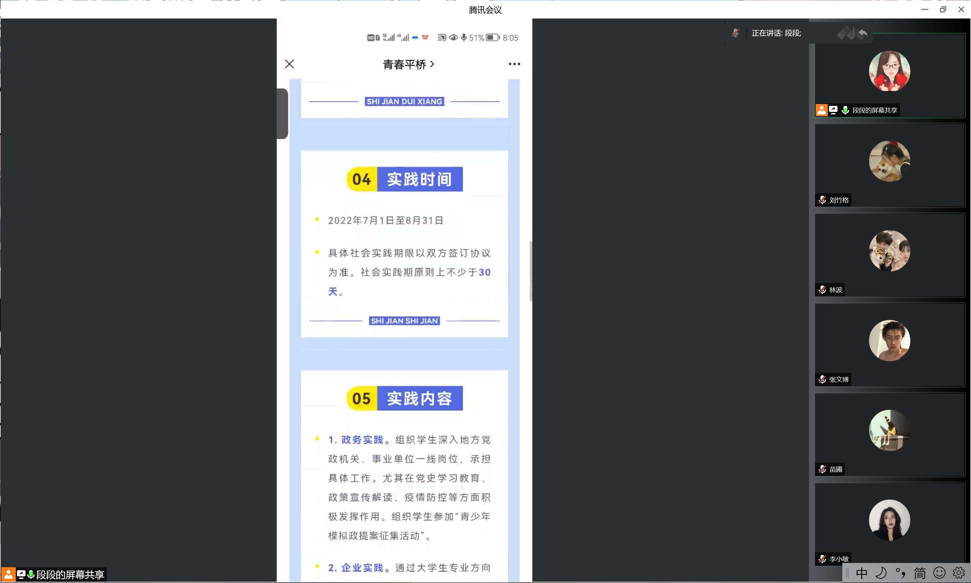 为迎接和学习宣传贯彻党的二十大为主线,结合学习党领导下中国青年运动的百年历程,坚持“受教育、长才干、作贡献”的宗旨。现代服务学院组织大学生返回家乡参与社会实践,帮助青年学生不断提升社会化能力,建立在外高校学子与家乡联系的制度化渠道。6月3日晚上,现代服务学院于线上腾讯会议的形式召开“喜迎二十大,永远跟党走,奋进新征程”2022年暑期社会实践志愿服务活动动员大会。会议由现代服务学院团总支书记段会利主持,团总支学生书记、副书记、各部部长、各部团干及21级团支部书记参加会议。