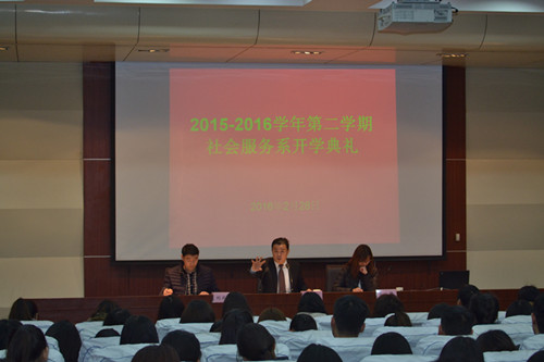 歌声袅袅辞旧岁,舞姿翩翩贺新春,东方拂晓红日光,辰星闪耀皓月长。2016年2月28日下午社会服务系全体师生在信息中心一楼隆重集会举行春季开学典礼。