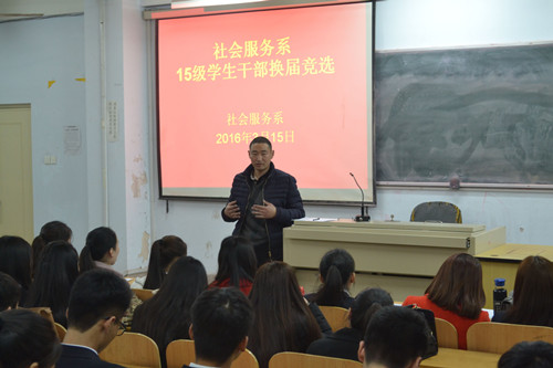 社会服务系于2016年3月15日,19点40在三楼北街举行了15级学生干部换届竞选大会。出席本次换届大会的嘉宾有:刘兆坤副书记,辅导员石帅老师以及学生会主席、部长、干事等!