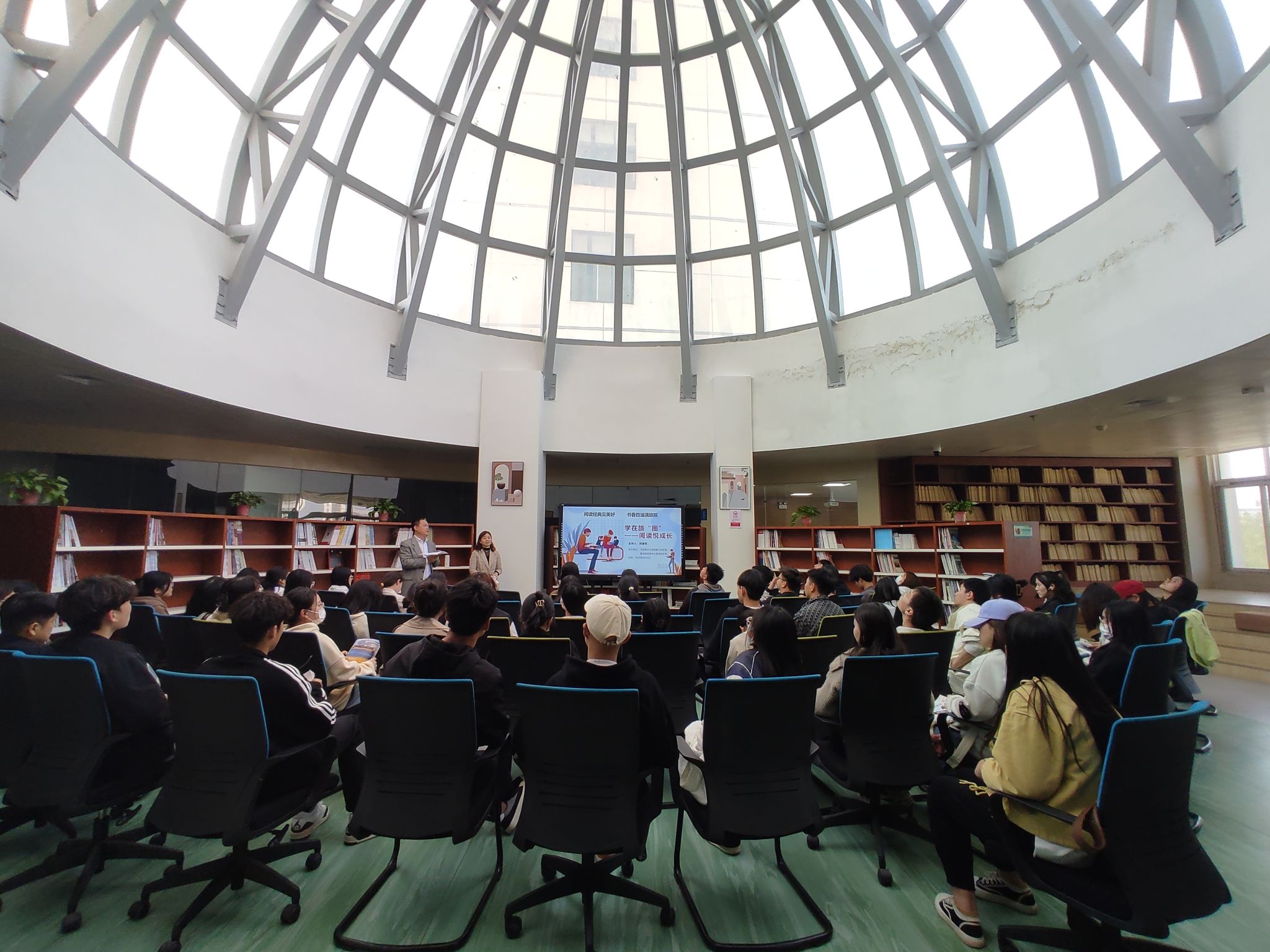 自活动发起,学生踊跃报名,预约名额很快报满。活动由图书馆信息网络中心联合党支部书记杨瑾主持。刘丽军围绕大学生成长需求,结合自身阅读和成长经历,从阅读的目的,选择和意义三个方面给同学们进行了分享。
