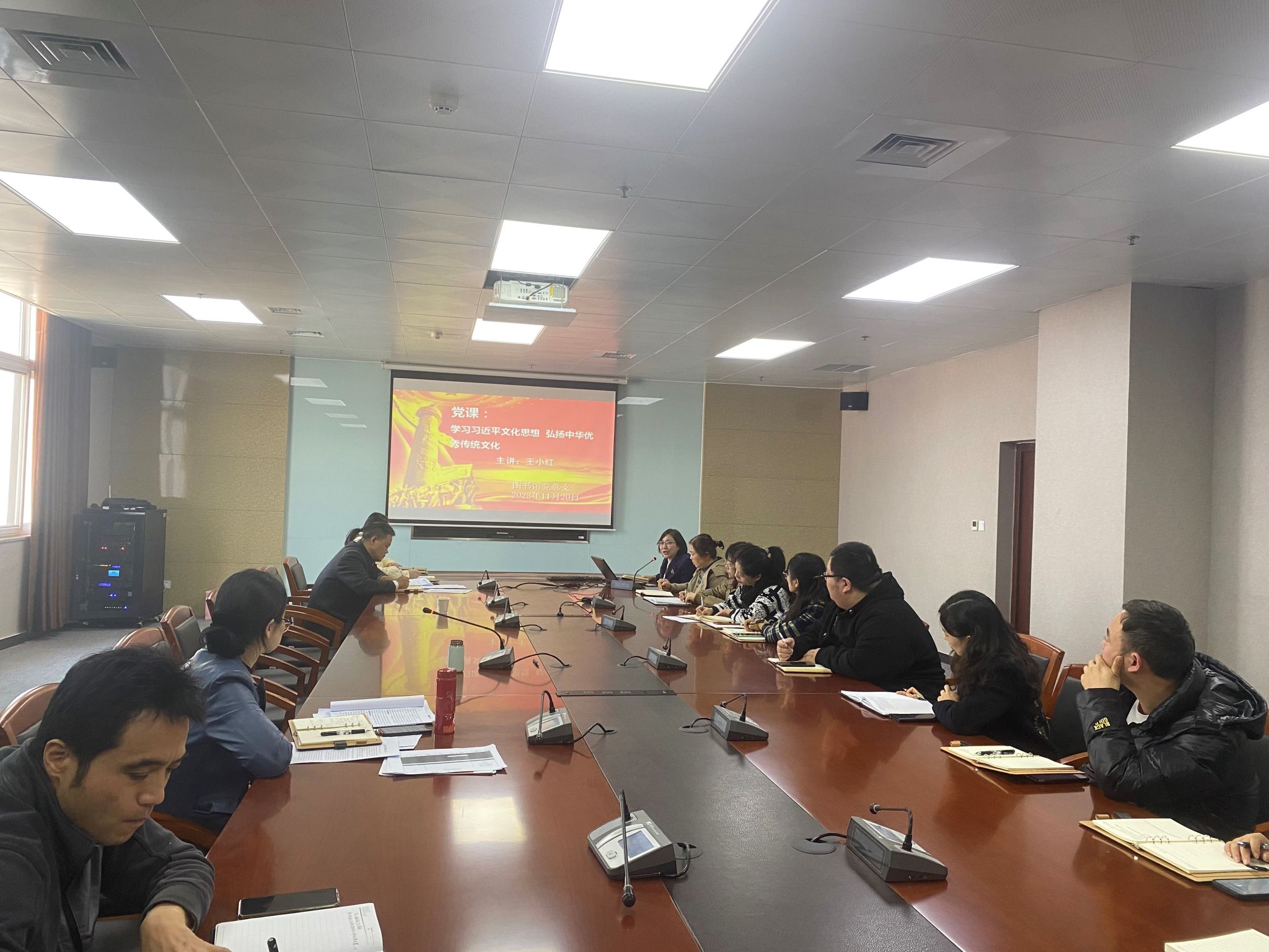 为深入学习贯彻习近平文化思想,推进主题教育走深走实,充分发挥图书馆文化阵地作用,2023年11月20日下午,图书馆党总支书记王小红以“学习习近平文化思想 弘扬中华优秀传统文化”为主题,在图书馆1503会议室为图书馆信息网络中心联合党支部全体党员和图书馆全体教职工上了一堂精彩的党课。
