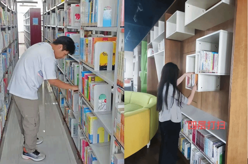 活动筹备阶段,图书馆各楼层负责人老师结合馆藏分布与空间特点,将馆内划分为文献借阅区、电子阅览区、现刊阅览区等多个功能片区,采用“动静分区”模式,制定“错峰不扰读”的清洁动线,实施书架深度除尘、地面清洁养护、设备设施除尘等任务。