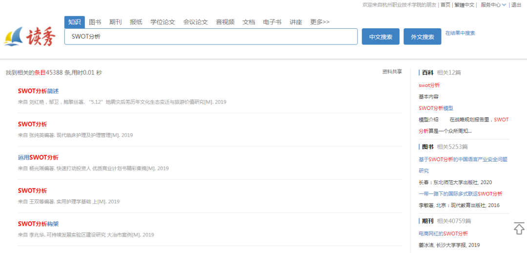 读秀学术搜索是由海量图书、期刊、报纸、会议论文、学位论文等文献资源组成的庞大知识系统,是一个可以对文献资源及其全文内容进行深度检索,并且提供原文传送服务的平台。