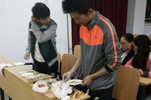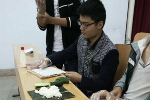 本次活动受到了大家的热烈响应,有五十名左右社员参加,现场气氛异常活跃,在过程中还不断有同学报名加入,将所给的材料制作成好看好吃的寿司。好多同学可能都第一次自己动手做寿司,但大家各施所长又相互合作,在砧板上大显身手,最后寿司都被一抢而空,整场活动自始至终都充满了活力。