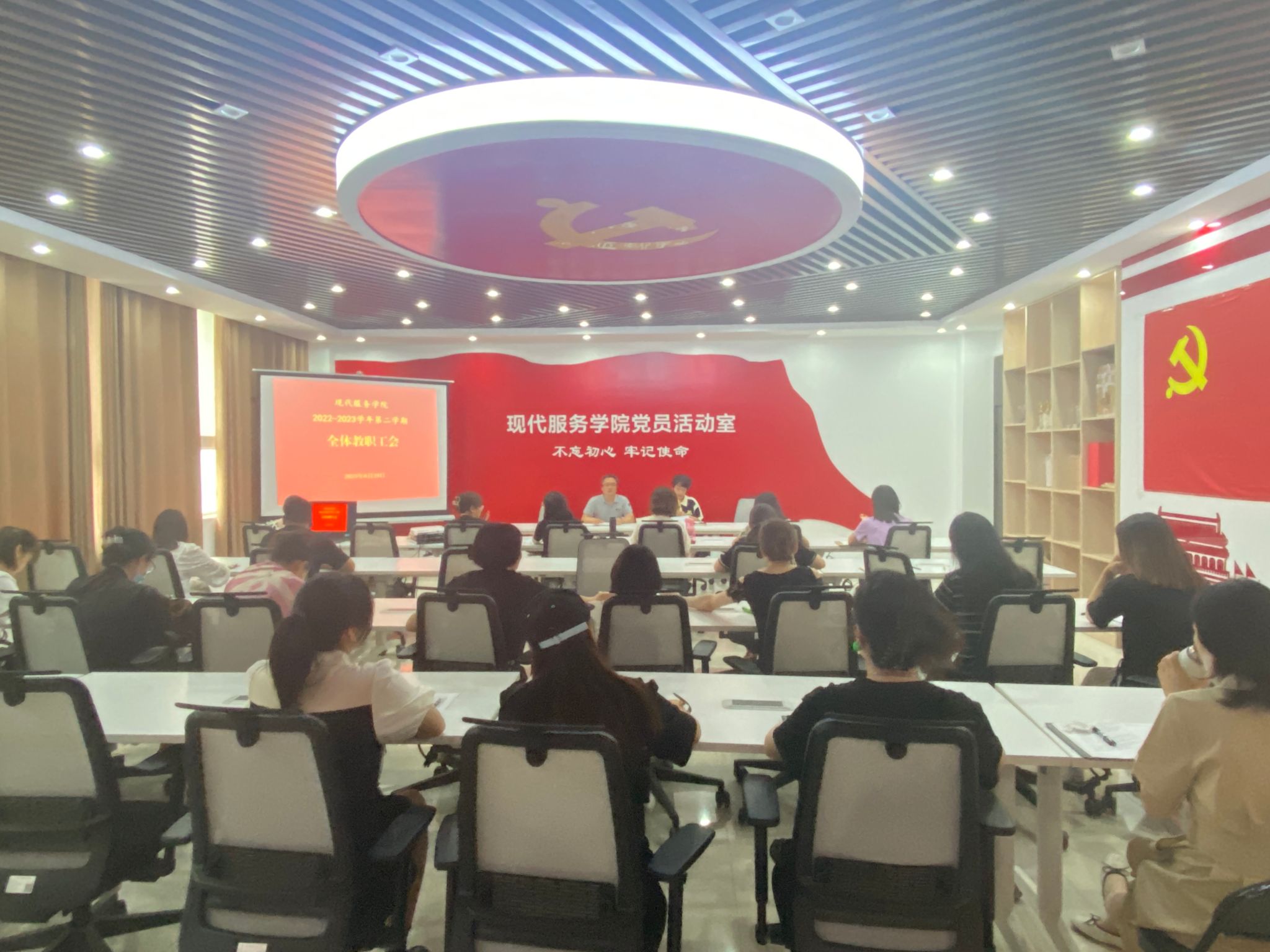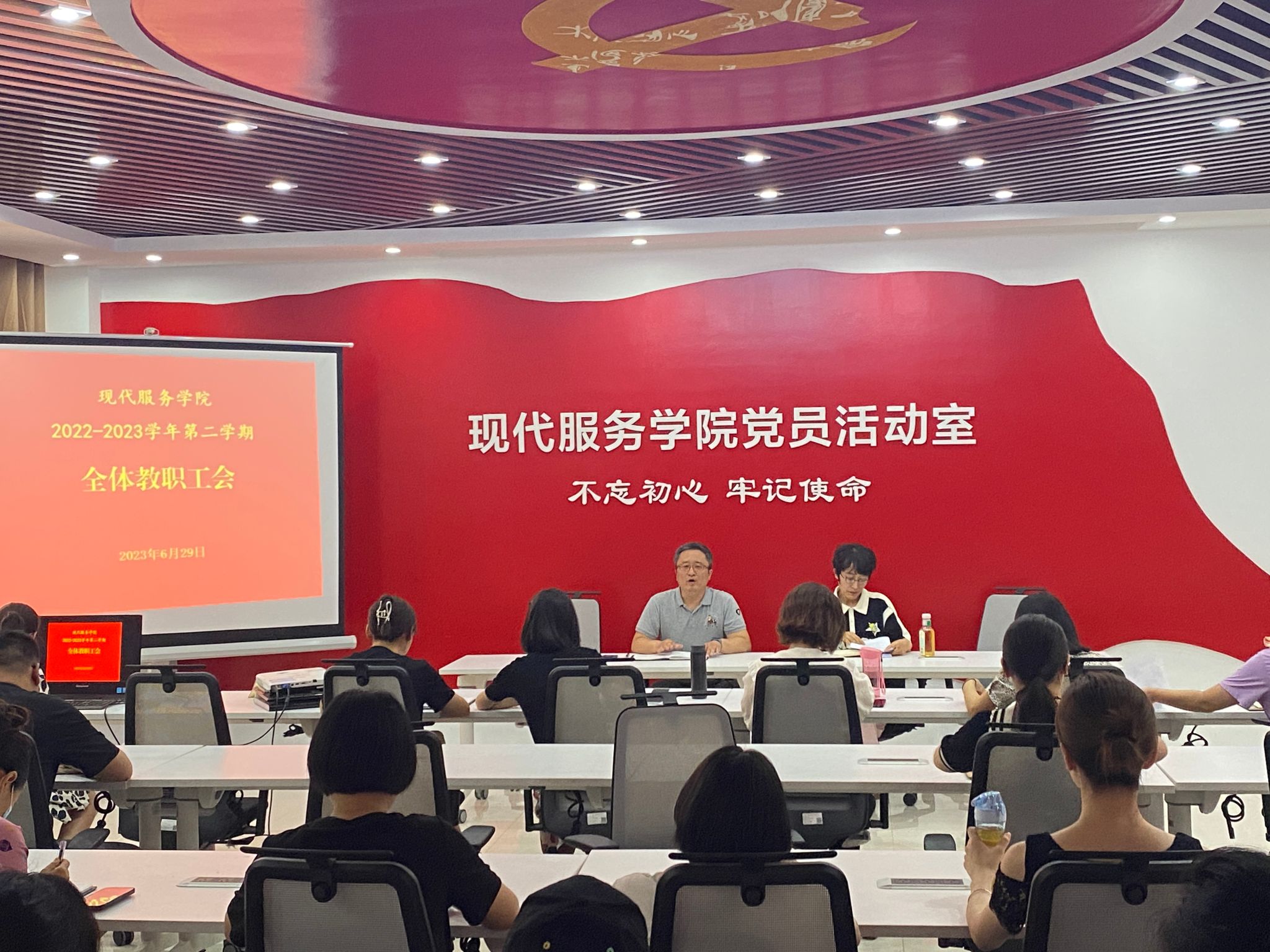 6月29日上午,现代服务学院召开2022-2023学年第二学期全体教职工大会。会议由现代服务学院党总支书记郭防主持,副书记岳正阳出席会议,全体教职工参加。