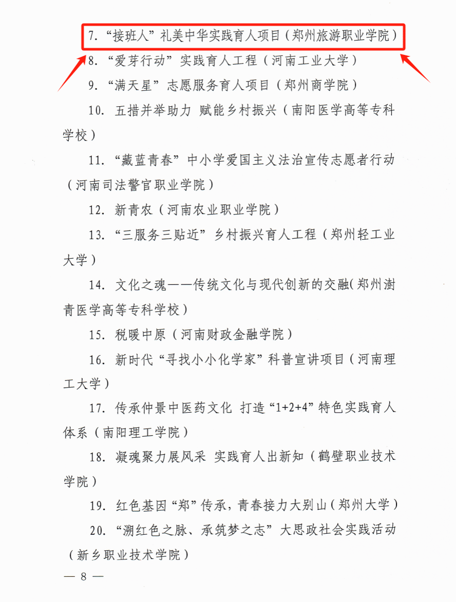 2023年12月共青团河南省下发《关于发布2023年度“活力杯”河南高校共青团基层基础工作大赛获奖名单的通知》。经校级初赛、省级复赛、省级决赛等环节,共评选出62 个实践育人工作项目、62 个微团课、92 个活力团支部、76 个活力社团获奖。其中海洋之神590登录入口“接班人”礼美中华实践育人项目荣获实践育人工作项目三等奖。