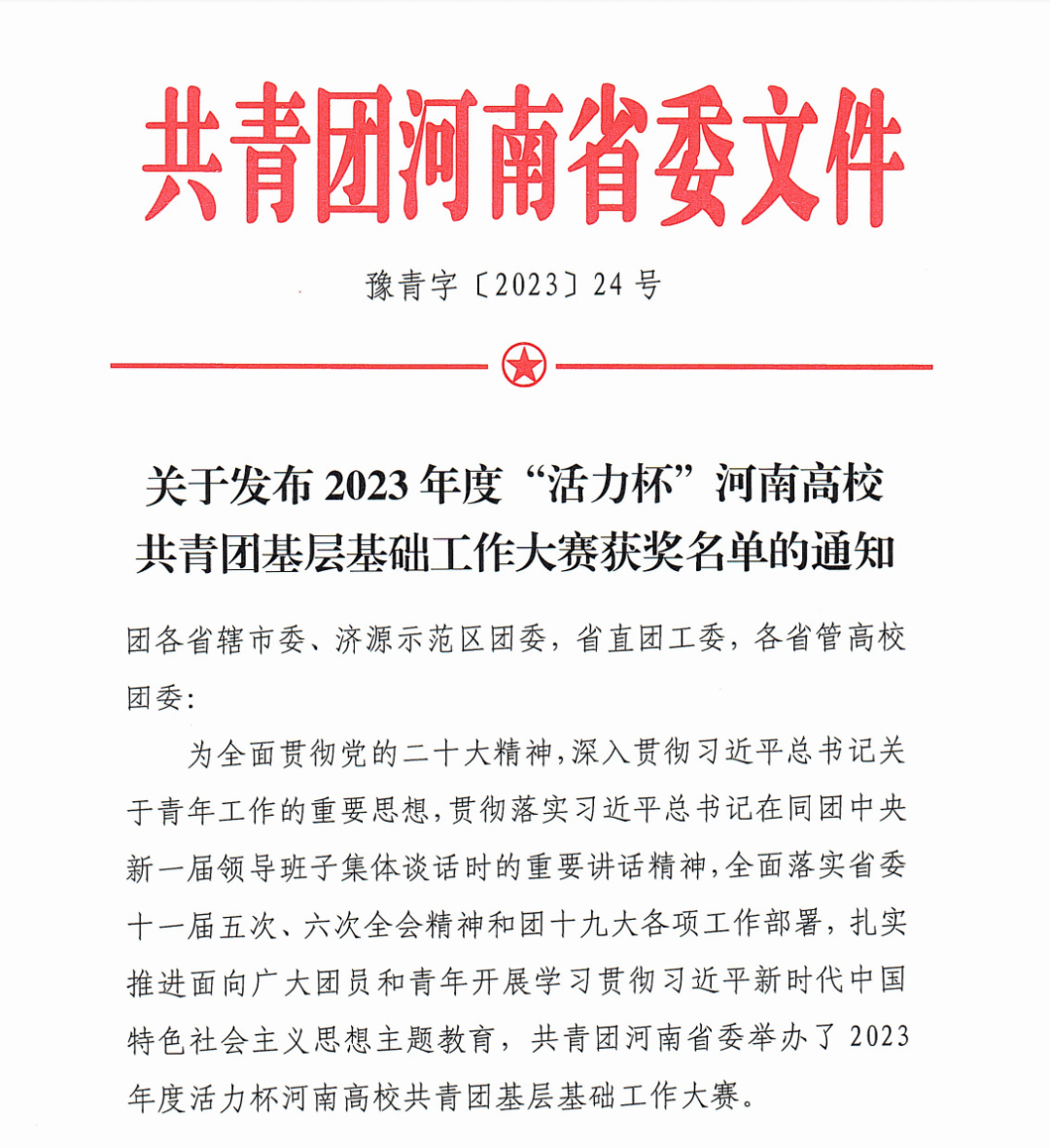 为全面贯彻党的二十大精神,深入贯彻习近平总书记关于青年工作的重要思想,贯彻落实习近平总书记在同团中央新一届领导班子集体谈话时的重要讲话精神,扎实推进面向广大团员和青年开展学习贯彻习近平新时代中国特色社会主义思想主题教育,共青团河南省委举办了2023年度“活力杯”河南高校共青团基层基础工作大赛。
