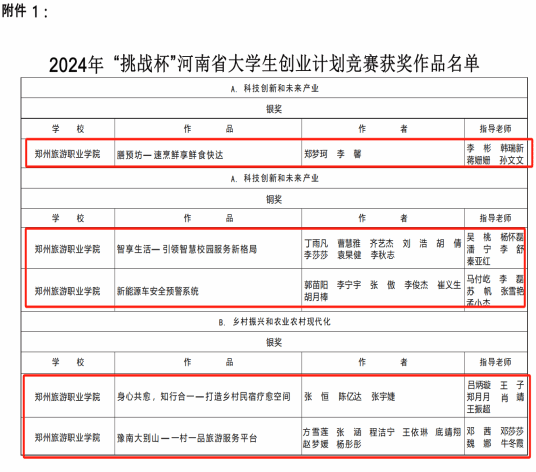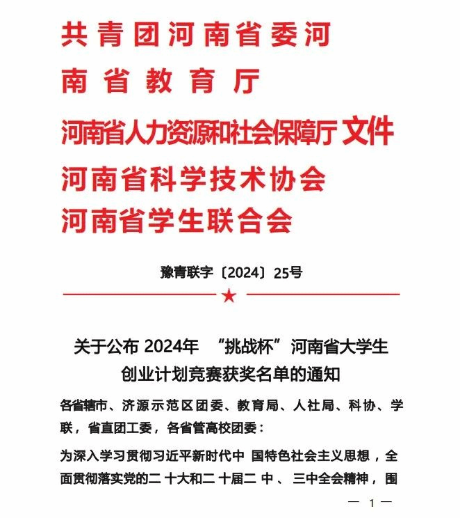 近日,共青团河南省委、河南省教育厅等5部门下发文件,《关于公布2024年“挑战杯”河南省大学生创业计划竞赛获奖作品的通知》(豫青联字〔2024〕25号)。