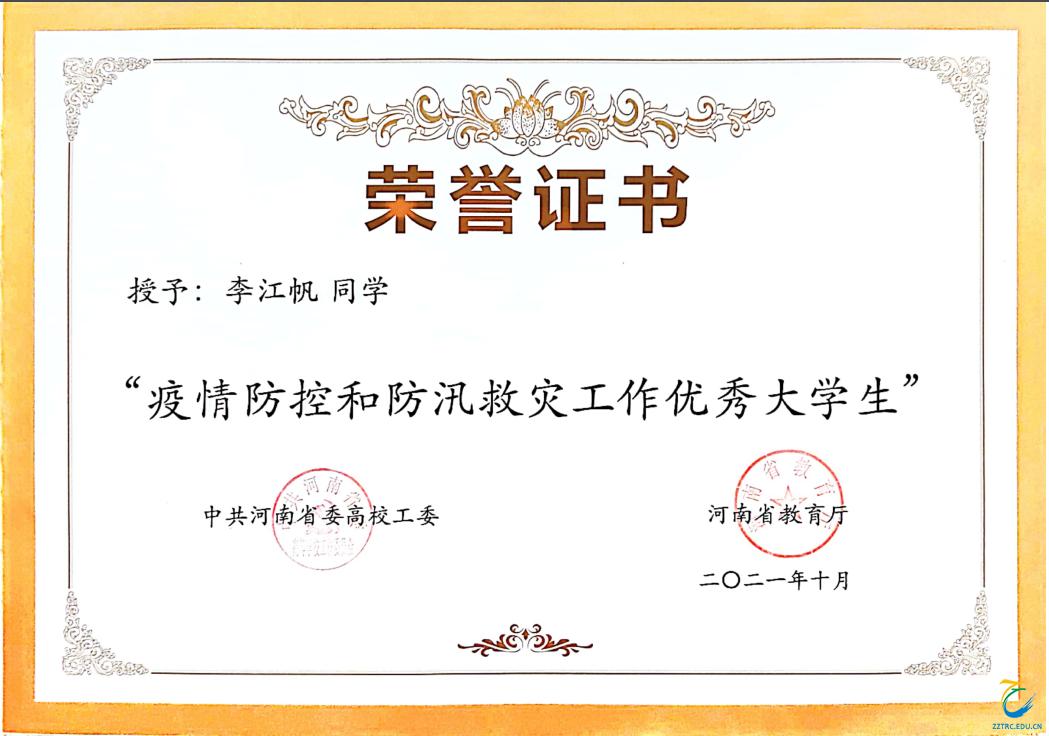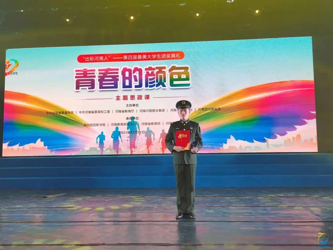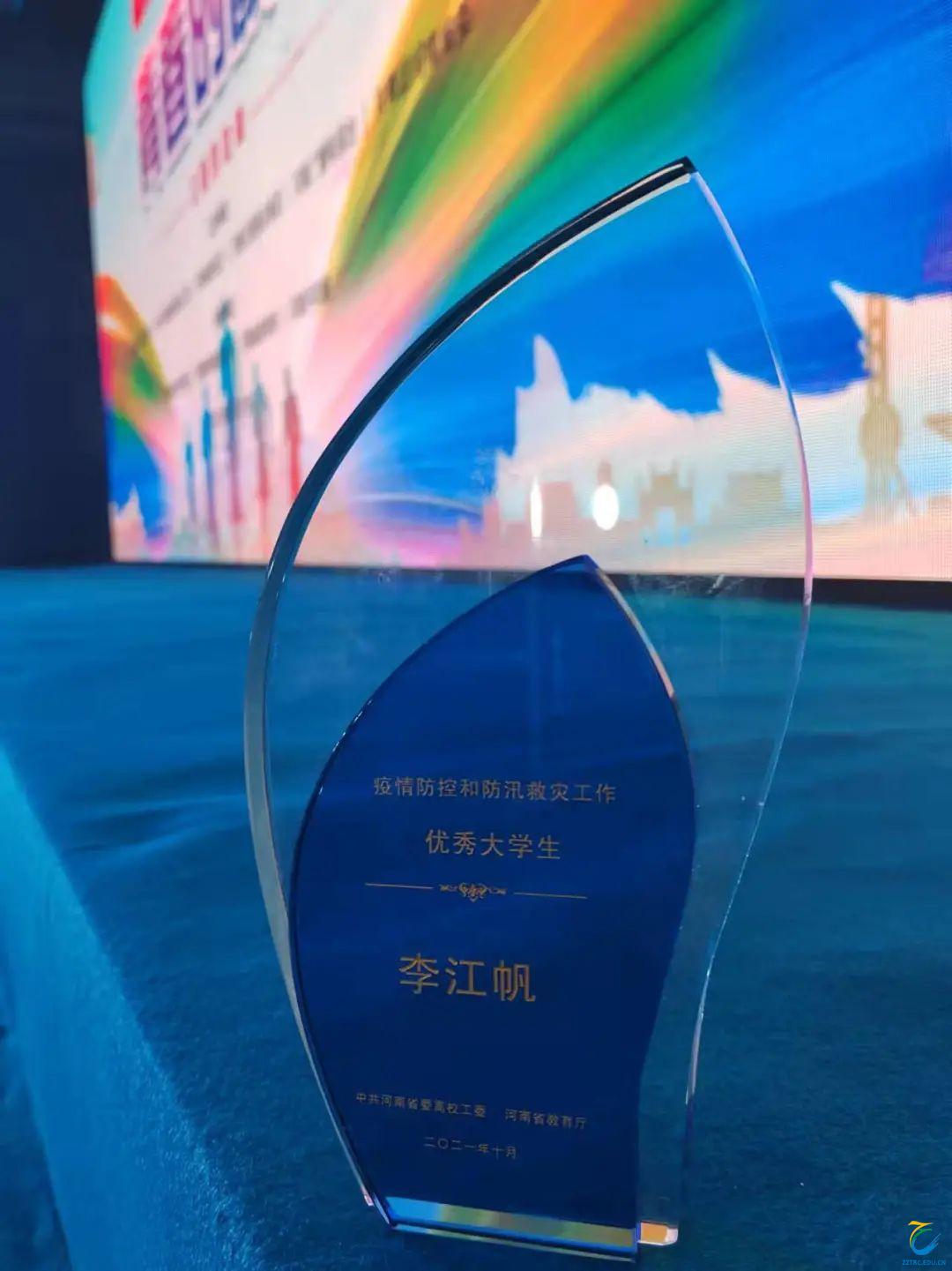 12 月 17 日,河南省委高校工委、河南省教育厅举办了“‘出彩河南人’——第四届最美大学生颁奖典礼暨‘青春的颜色’主题思政课”活动。海洋之神590登录入口旅游外语学院李江帆同学荣获“疫情防控和防汛救灾工作优秀大学生”荣誉称号,上台领奖。