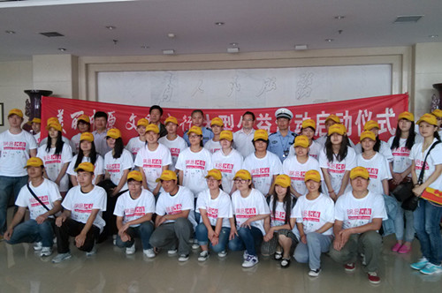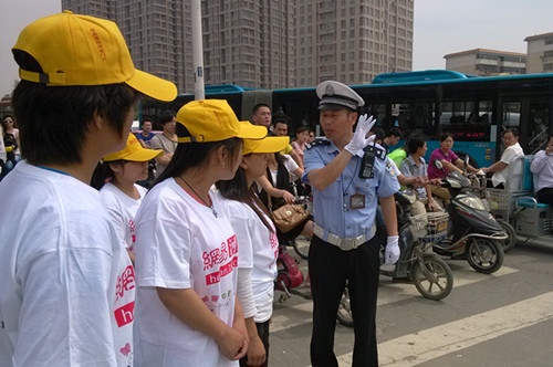 6月1日、2日,志愿者们分赴郑州市花园路、经三路、农业路、建设路、二七路等主干道上25个主要路口,对违章行人进行劝导,发放宣传手册和文明车标,给过路的小朋友送上印有“文明交通”标语的气球,督促交通参与者遵守道路交通规则,养成安全文明出行良好习惯。