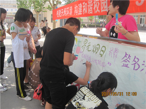 5月31日,世界无烟日,旅游管理系青年志愿者协会于2011年5月31日中午12:00在西教学楼前举办了以“无烟校园,从我做起”为主题的签名活动。
