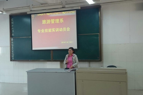 2014年4月22日16时,旅游管理系在我院西教学楼301多媒体教室举行了针对12级同学的专业技能动员会。系主任胡华为同学们做岗前培训,再一次重申了我院下一阶段对实习生的课程安排,并对同学们提出的疑虑做出了详细的答复,希望同学们能够好好把握余下的在校时间,多掌握一些对实习有帮助的技能。同时,旅游管理系团总支书记金慧慧也对即将离校的同学提出要求:希望同学们能够端正心态、好好珍惜在校时间,在未来的实习岗位上要严格要求自己,为自己的未来努力奋斗。