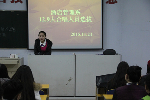 为了丰富学生的校园生活、迎接12.9晚会 。酒店管理系学生会于2015年11月24日晚上7:30在校史馆一楼报告厅组织12.9大合唱选拔活动