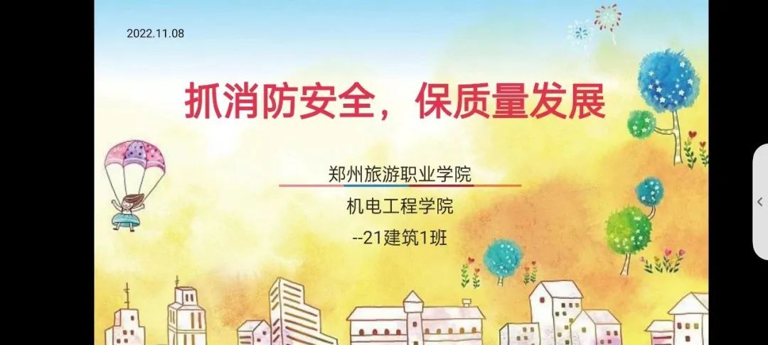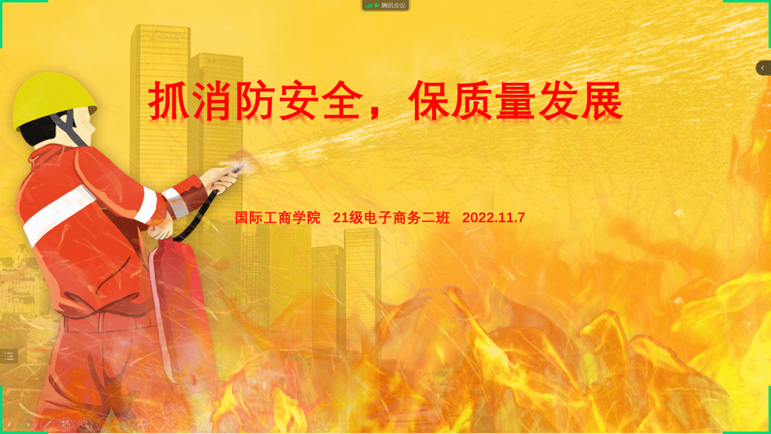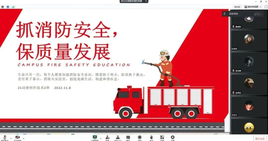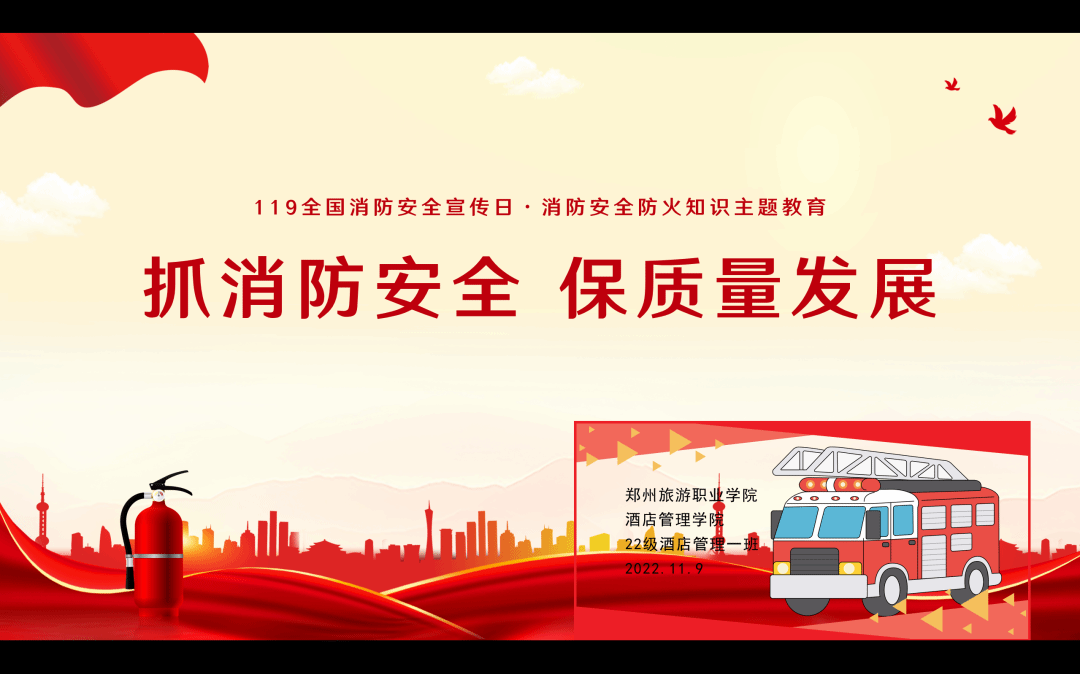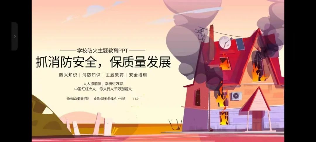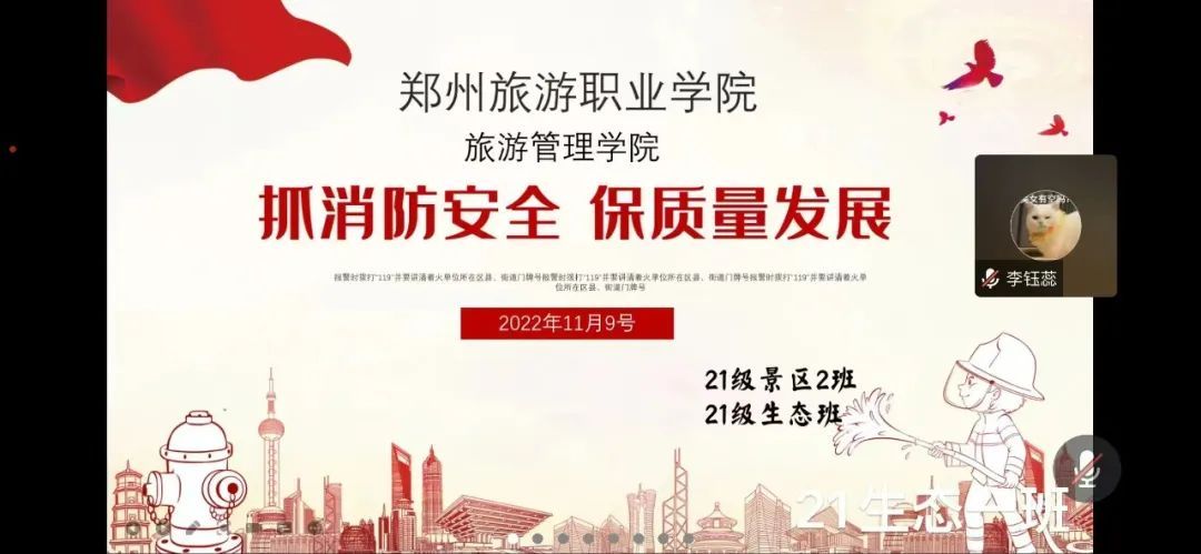 11月9日是第31个全国消防日,为着力增强师生消防安全意识,提高师生的消防自救能力。11月7日-11日,全校开展“抓消防安全,保高质量发展”主题团日活动(班会),通过线上消防安全主题班会的形式,把消防安全深入人心。