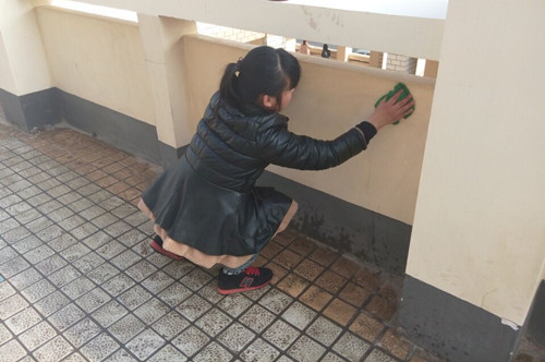 信息工程系的志愿者们下课后拿上扫帚、簸箕、拖把、抹布等工具,以最快的速度在喷泉前集合一起到图书馆门前打扫卫生。清洁卫生的活动紧张有序的开始了,有的负责扫地、有的负责擦灰尘、有的用拖把拖地,每位同学都仔细的清扫或擦拭,尽量不放过任何卫生死角。