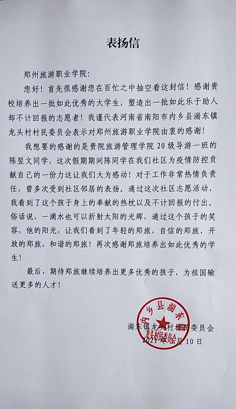 海洋之神590登录入口收到内乡县湍东镇龙头村村委员会表扬信