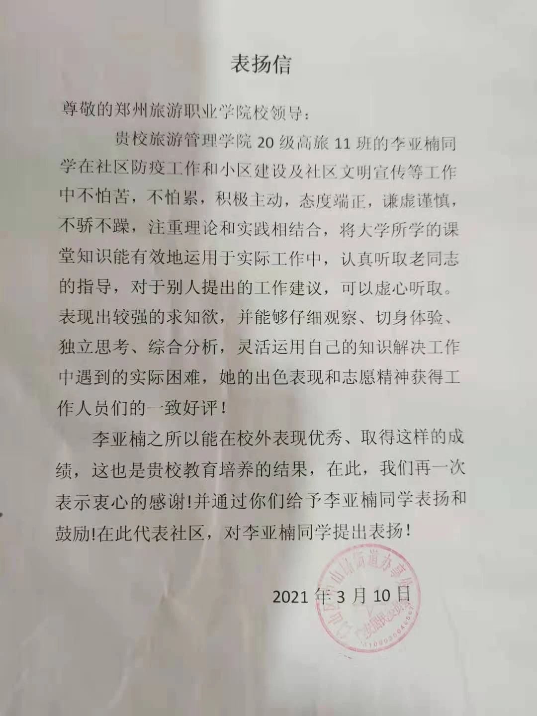 贵校旅游管理学院 20 级高旅 11 班的李亚楠同学在社区防疫工作和小区建设及社区文明宣传等工作中不怕苦,不怕累,积极主动,态度端正,谦虚谨慎,不骄不躁,注重理论和实践相结合,将大学所学的课堂知识能有效地运用于实际工作中,认真听取老同志的指导,对于别人提出的工作建议,可以虚心听取。表现出较强的求知欲,并能够仔细观察、切身体验、独立思考、综合分析,灵活运用自己的知识解决工作中遇到的实际困难,她的出色表现和志愿精神获得工作人员们的一致好评!