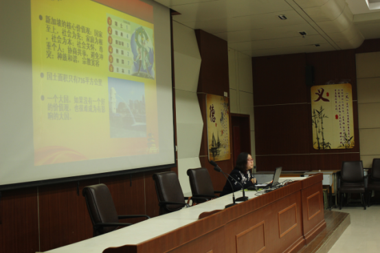 于婕老师担任此节课的主讲。她以“社会主义价值观”开篇,以我国不同时期的价值观念展开论述。她指出:在这样一个社会思想多元化的时代背景下,践行社会主义核心价值观,需要全社会的主动参与要在全社会大力弘扬爱国主义、集体主义、社会主义思想,倡导社会主义基本大的规范,促进良好的社会风气的发展和形成,特别是青少年树立正确的社会主义荣辱观。让同学们真正理解社会主义核心价值观,并通过学校教育、理论学习、等各种方式,广泛传播社会主义核心价值观,营造良好的舆论环境,形成一种激发正能量的良好氛围,只有内化于心,才能外化于行。最后她希望同学们能够不断提高思想道德水平,加强自身修养,使个人的价值观得到提升。