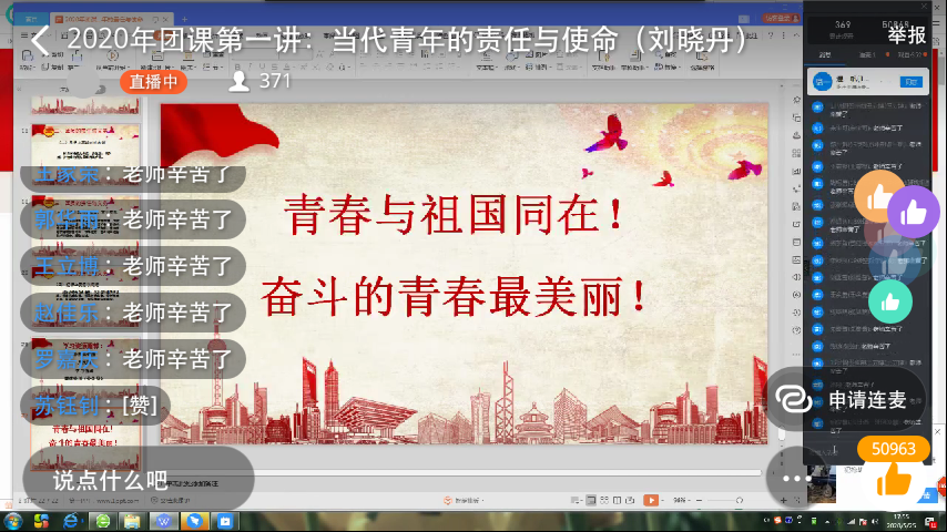 5月25日16点,海洋之神590登录入口通过网络直播授课的方式开展了2020年青马工程'先锋骨干计划'培训暨发展新团员第一讲——当代青年的责任与使命,此次授课由旅游外语学院团总支书记刘晓丹老师主讲。
