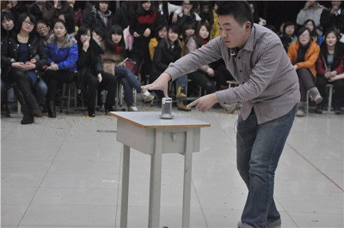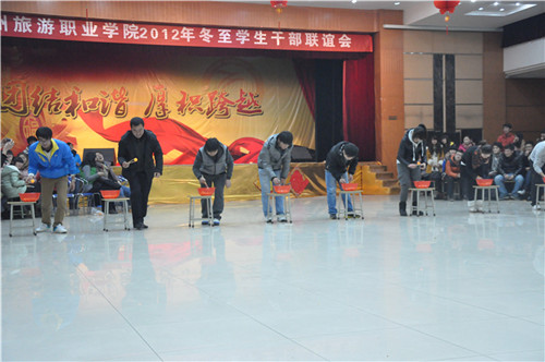 在主持人幽默的主持中,联谊会正式开始,各系精彩的节目迎来了全场阵阵掌声与欢呼,激情好玩的趣味游戏更是带动了现场的气氛,伴随着热气腾腾的饺子,学生干部们释放除了一学期来的劳累与辛苦,在“吹蜡烛”游戏中,同学们争分夺秒,在原地旋转十圈后虽头昏眼花,依然奋力向放着蜡烛的凳子跑去。有些同学跑到了别人的跑道,有些同学甚至摔倒在地,游戏的激情氛围同时也带动了院团委老师们踊跃尝试。