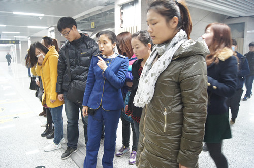 本次活动也是对地铁志愿者的一次临岗培训。下午1:30分,志愿者们按照之前的分组情况准时集合完毕并乘车前往目的地。前三组到人民南路站地铁一号线,后两组则到紫荆山站地铁一号线,由各组组长带领大家到达相应地点。