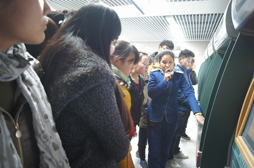 到达地铁站点后,志愿者们在工作人员的带领下进站参观,全方位的参观了站台和候车厅,此外还有专业的工作人员为大家讲解地铁的结构设施、购票机的使用、以及乘客正确乘坐地铁的方法。