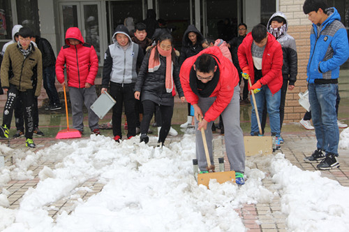 2015年11月24日下午,酒店管理系学生在学院内成功开展了校园清雪活动。酒店管理系的学生积极参加本次活动。