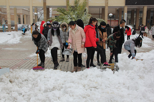校园清雪活动不仅为同学们创造了舒适、优雅的校园环境,更展现出同学们良好的精神面貌,加强了同学们的团结意识,对学院的文明校园建设起到了积极的推动作用。