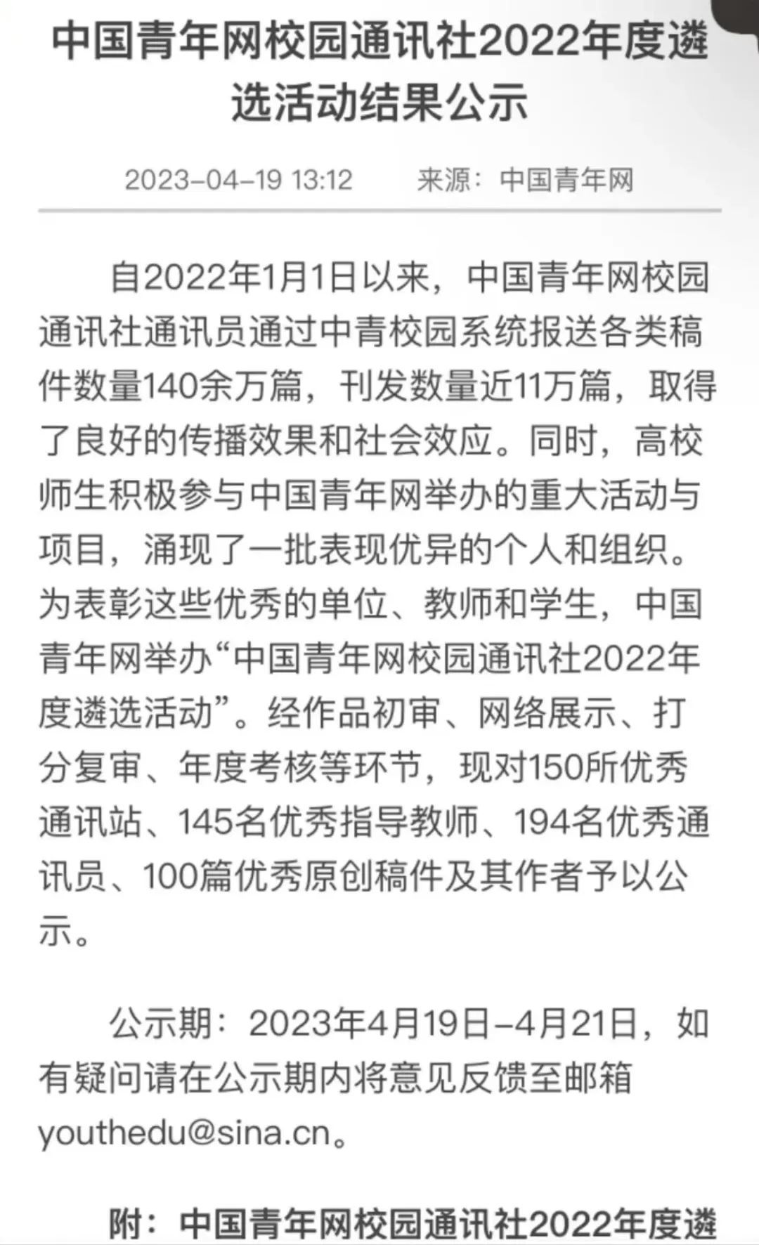 据悉,自2022年1月1日以来,中国青年网校园通讯社通讯员通过中青校园系统报送各类稿件数量140余万篇,刊发数量近11万篇。这是学校首次在中国青年网此项活动中获奖,为师生起到示范引领作用。
