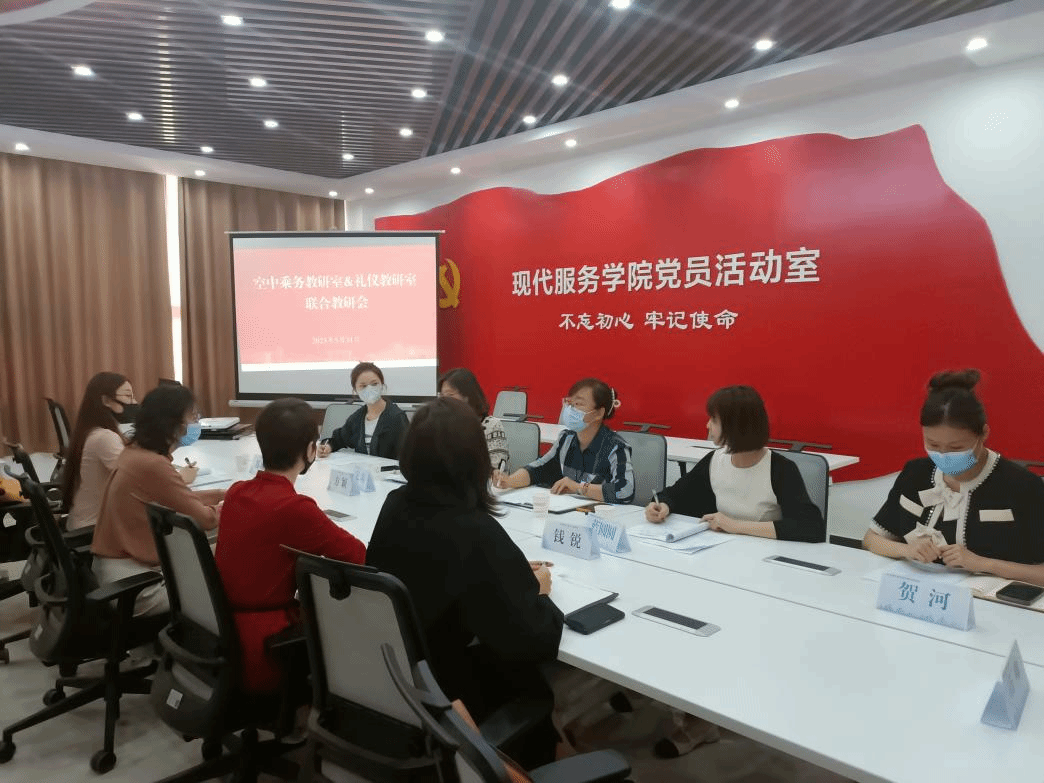 2023年5月31日下午,现代服务学院空中乘务专业教研室和基础部礼仪教研室在现代服务学院208会议室展开联合教研。由现代服务学院副院长定琦主持此次会议,空中乘务专业教研室主任张莹,教师蓝圆圆、贺河、李博宁,与礼仪教研室主任方颖,教师王建华、钱锐、苏雨珊参与了此次主题为“促进礼仪课程内容、教学标准及评价方式的有效性探讨”的联合教研活动。