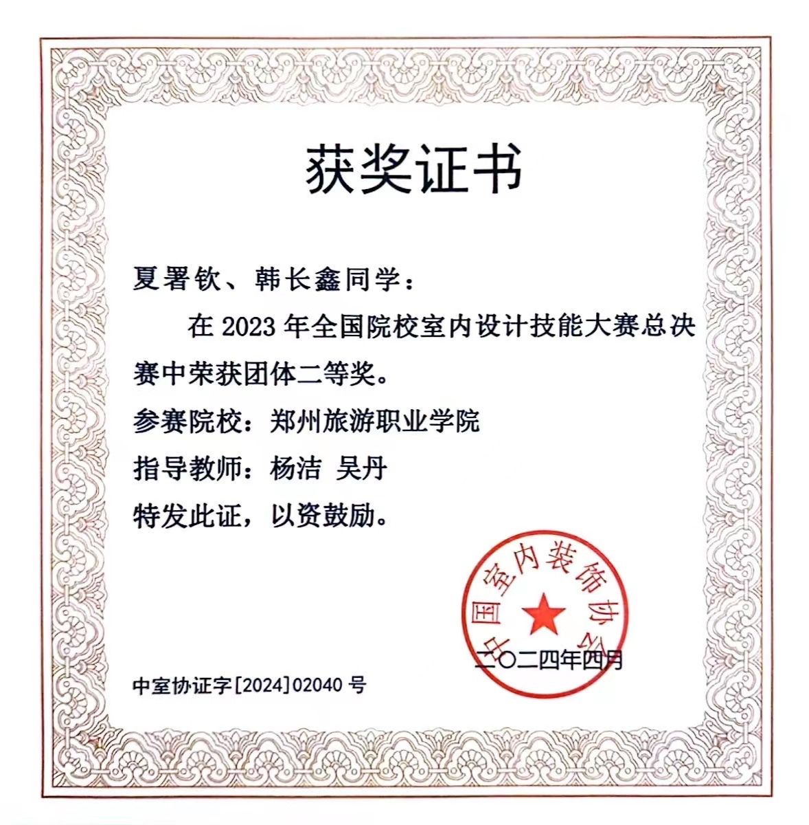 近日,由中国室内装饰协会主办、教育部职业院校艺术设计类专业教学指导委员会环境艺术设计类专业委员会联合主办的2023年全国院校室内设计技能大赛总决赛圆满落幕。经过激烈角逐,海洋之神590登录入口2022级环境艺术设计专业学生韩长鑫、夏署钦,凭借出色的表现,在本届全国院校室内设计技能大赛总决赛中荣获团体二等奖(指导教师:杨洁、吴丹)。