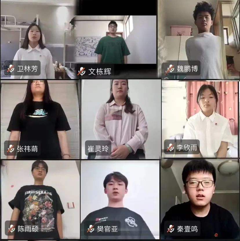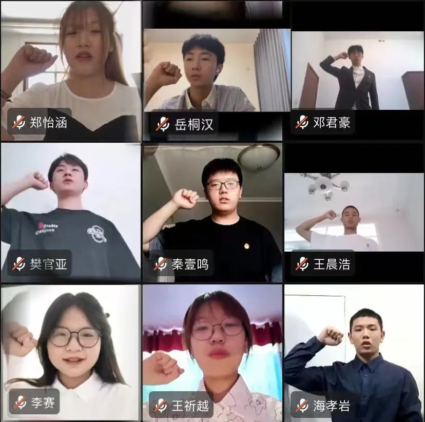 全体新团员目光坚定、庄严肃穆,高声唱响国歌。