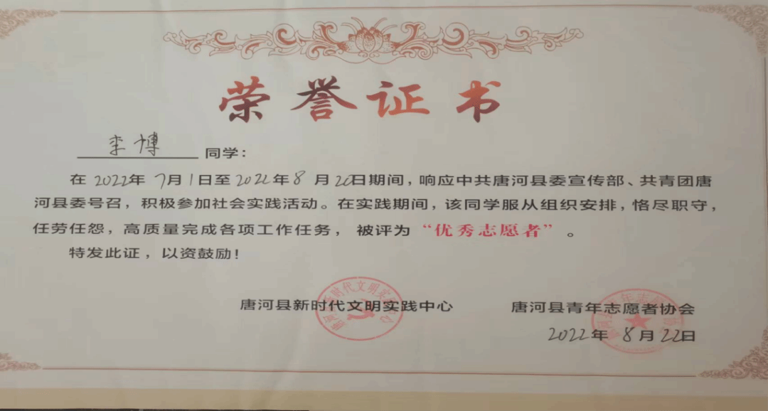 (团支部入党积极分子李博被评为“优秀志愿者”)