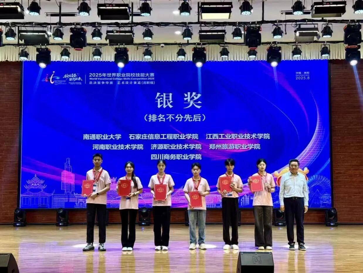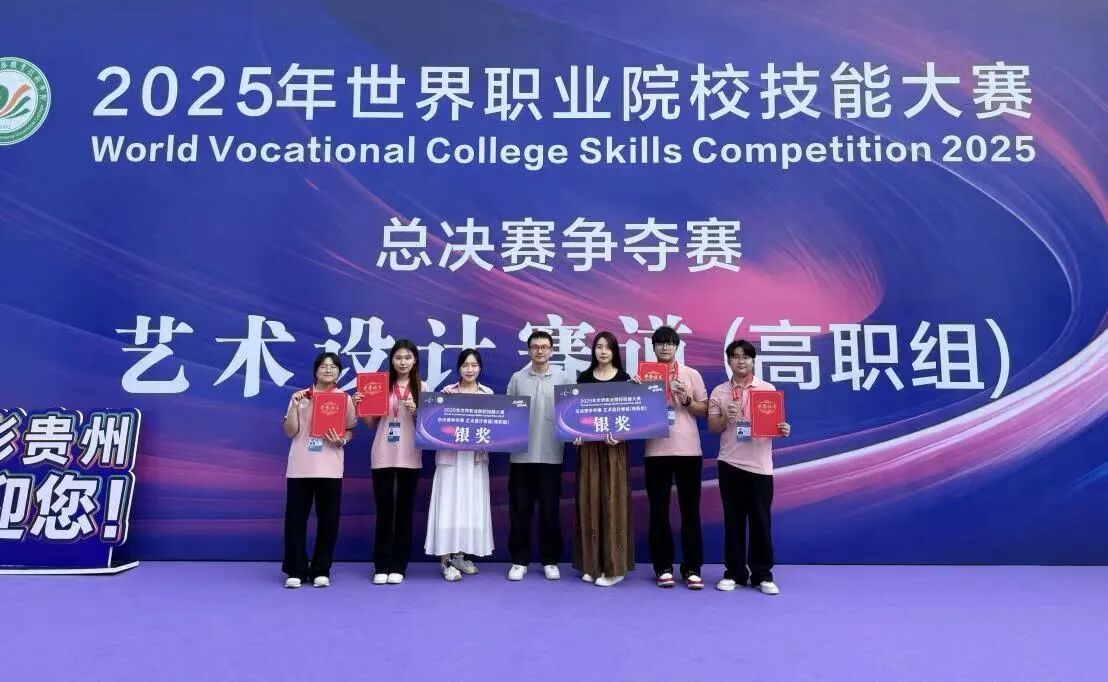 2025年世界职业院校技能大赛总决赛争夺赛艺术设计赛道于8月26日至8月28日在贵州电子商务职业技术学院成功举办。由我院教师张侃、李甜甜、程夏共同指导黄浩、魏宏庆、李梦婷、尹培雅四位同学组成的参赛团队在比赛中凭借扎实的专业功底、创新的设计理念和出色的团队协作,最终斩获银牌,充分展现了我院在艺术设计领域的教育成果与人才培养实力。