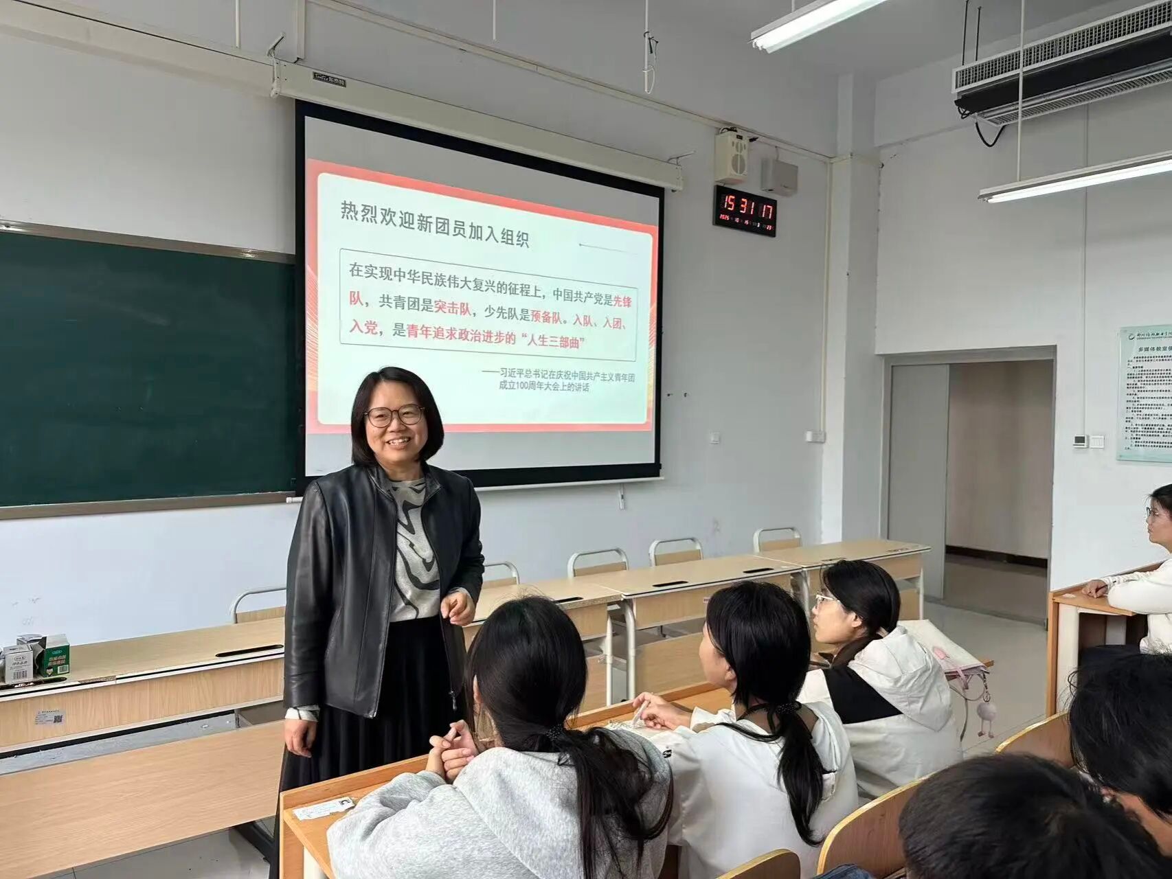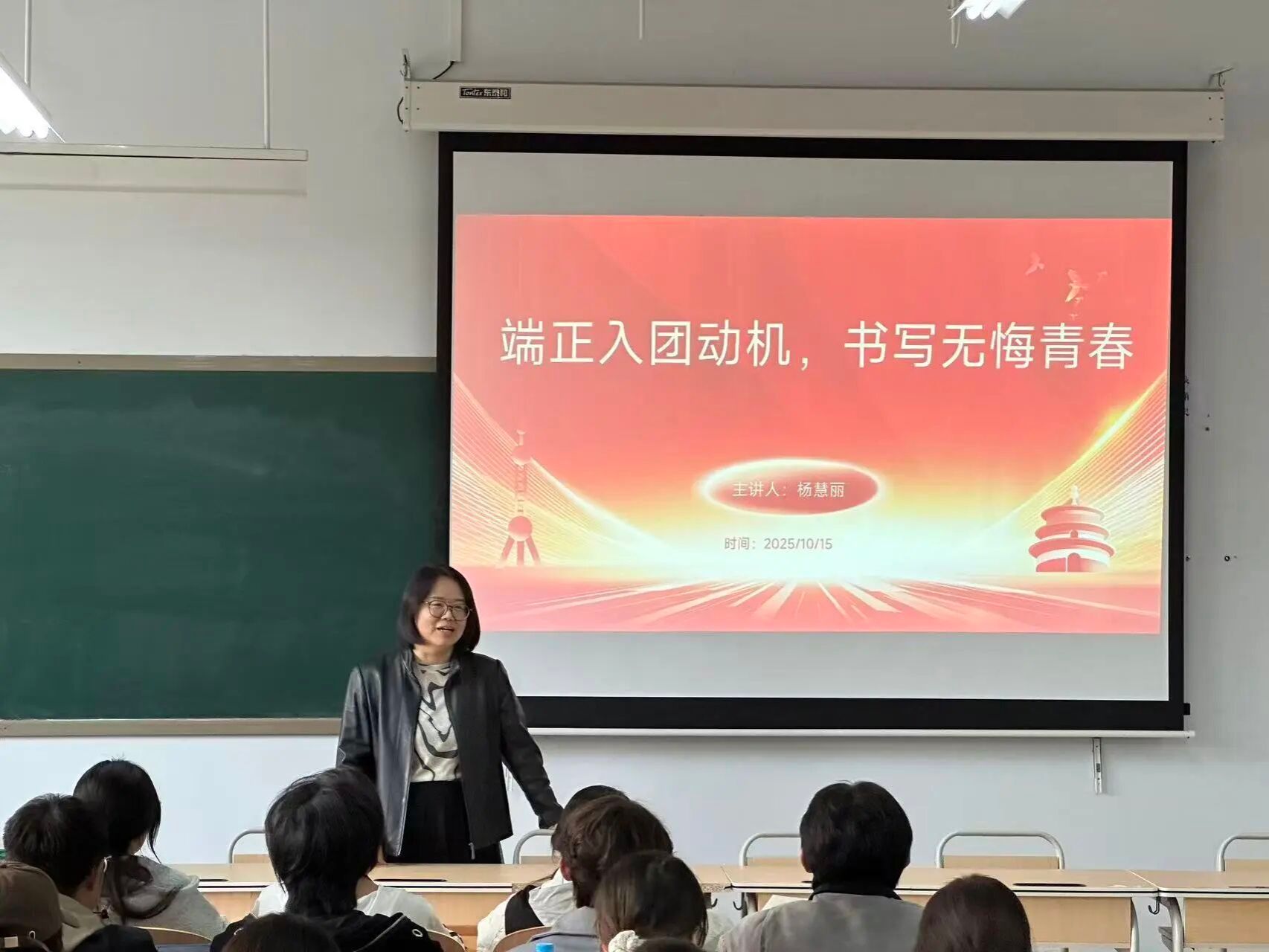 数字文创学院党总支书记杨慧丽开展2025年发展新团员培训班第一讲。她以《端正入团动机,书写无悔青春》为题进行专题团课。首先,杨慧丽以“你为何向往加入中国共产主义青年团”为核心问题引发学员思考,通过学习全国第一支青年突击队、红旗渠畔“铁姑娘”等青年事迹榜样,深刻阐释“青年在中国是什么样的”。同时带领积极分子回顾共青团百年奋斗历程,明确共青团作为党的助手和后备军的重要定位。她强调,青年团员要发挥模范作用,端正入团动机,提高政治理论水平和思想觉悟。