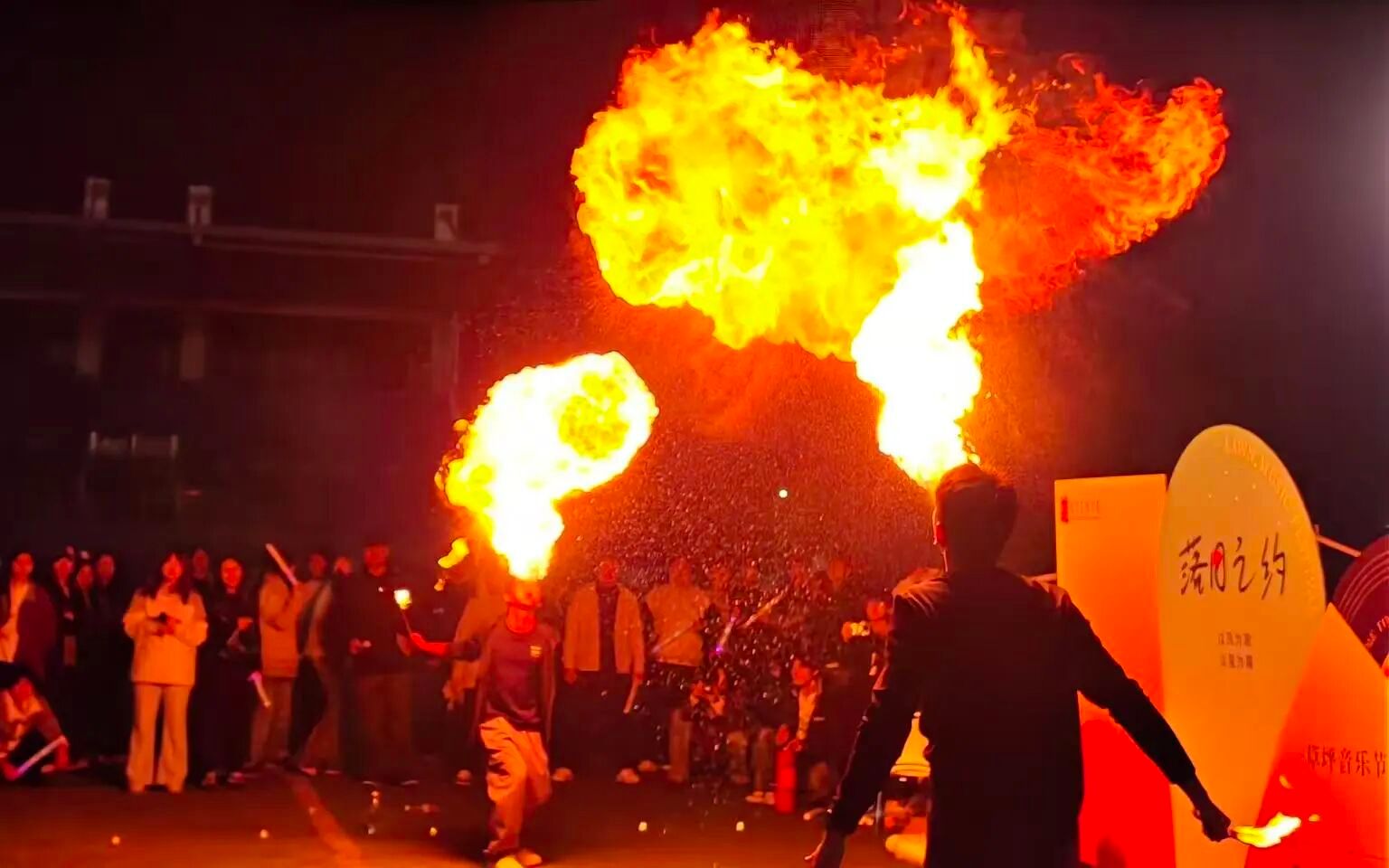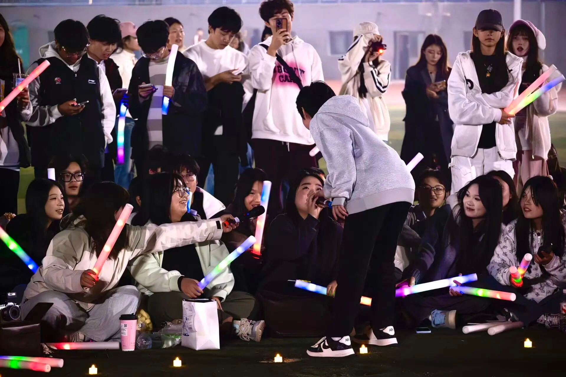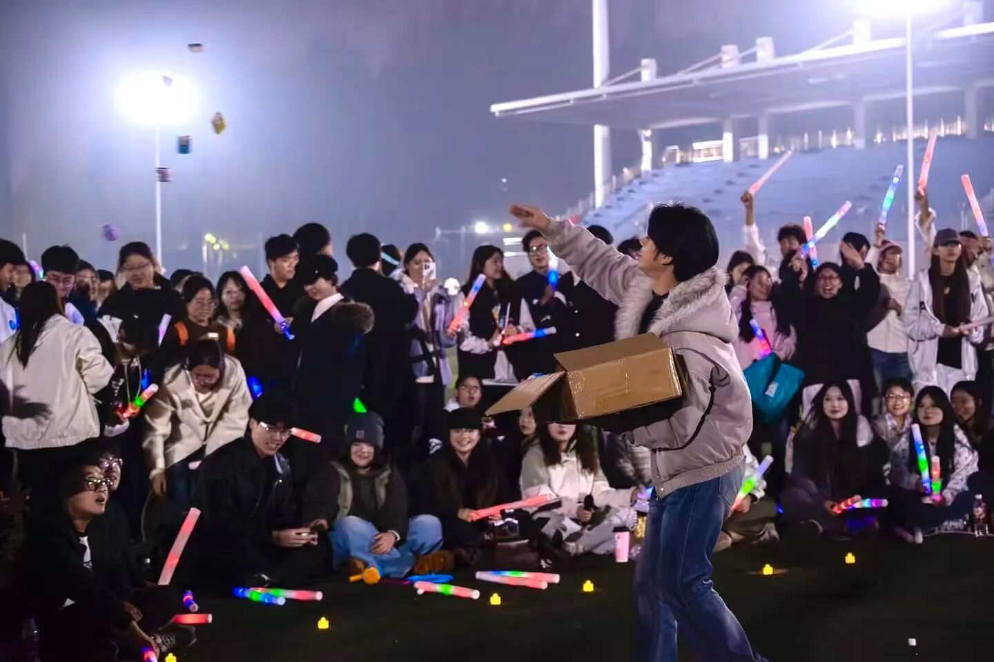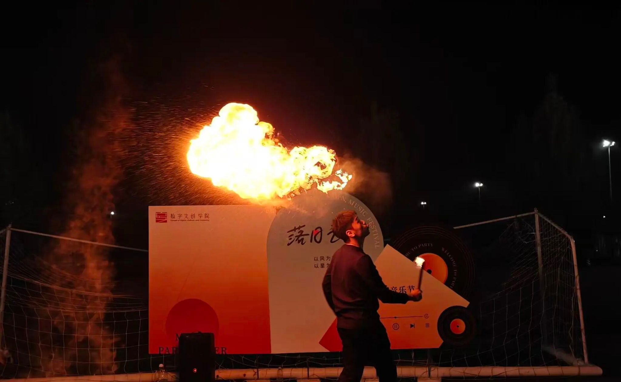 除了精彩的歌唱与舞蹈节目,音乐节的互动环节更是将氛围推向高潮。令人眼前一亮的喷火表演登场时,火焰在夜色中绽放出耀眼光芒,惊险又震撼的画面让观众惊呼连连;趣味十足的歌词接龙游戏中,现场同学踊跃举手参与,大家在绞尽脑汁接唱的过程中欢笑不断。在活动中更是精心准备了小礼物,通过两位主持人趣味互动的方式送到大家手中。小小的礼物不仅传递着温暖,更让整场音乐节的欢乐氛围持续升温,欢乐气息弥漫在草坪的每个角落。